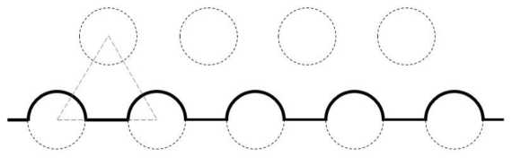 Второй подход. Инерционность оценивается исходя из характерного размера, пропорционального пути передачи тепла в силумине, огибающего гранулы диоксида урана. Линейный размер гранул принят равным минимальному из [6, 7] и составляющему 250 мкм. Рассматривалась модель, в соответствие с которой гранулы представляют собой одинаковые шары, расположенные в равносторонней треугольной решетке со стороной 320 мкм. Модель выбрана исходя из принятого диаметра гранул и объемного содержания урана в ТК (рис. 2). Области, занятые пустотами, считались находящимися вне огибающей.