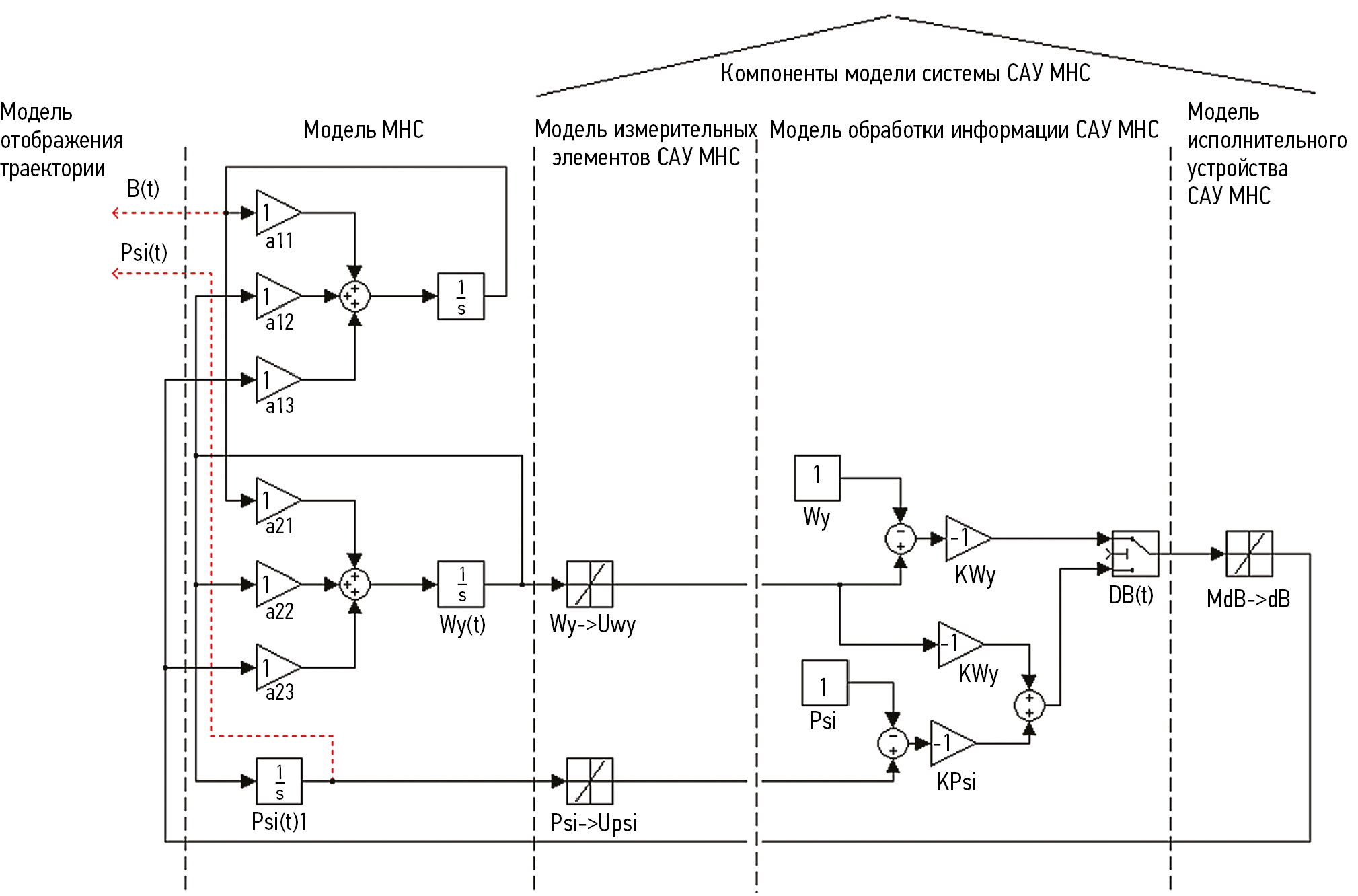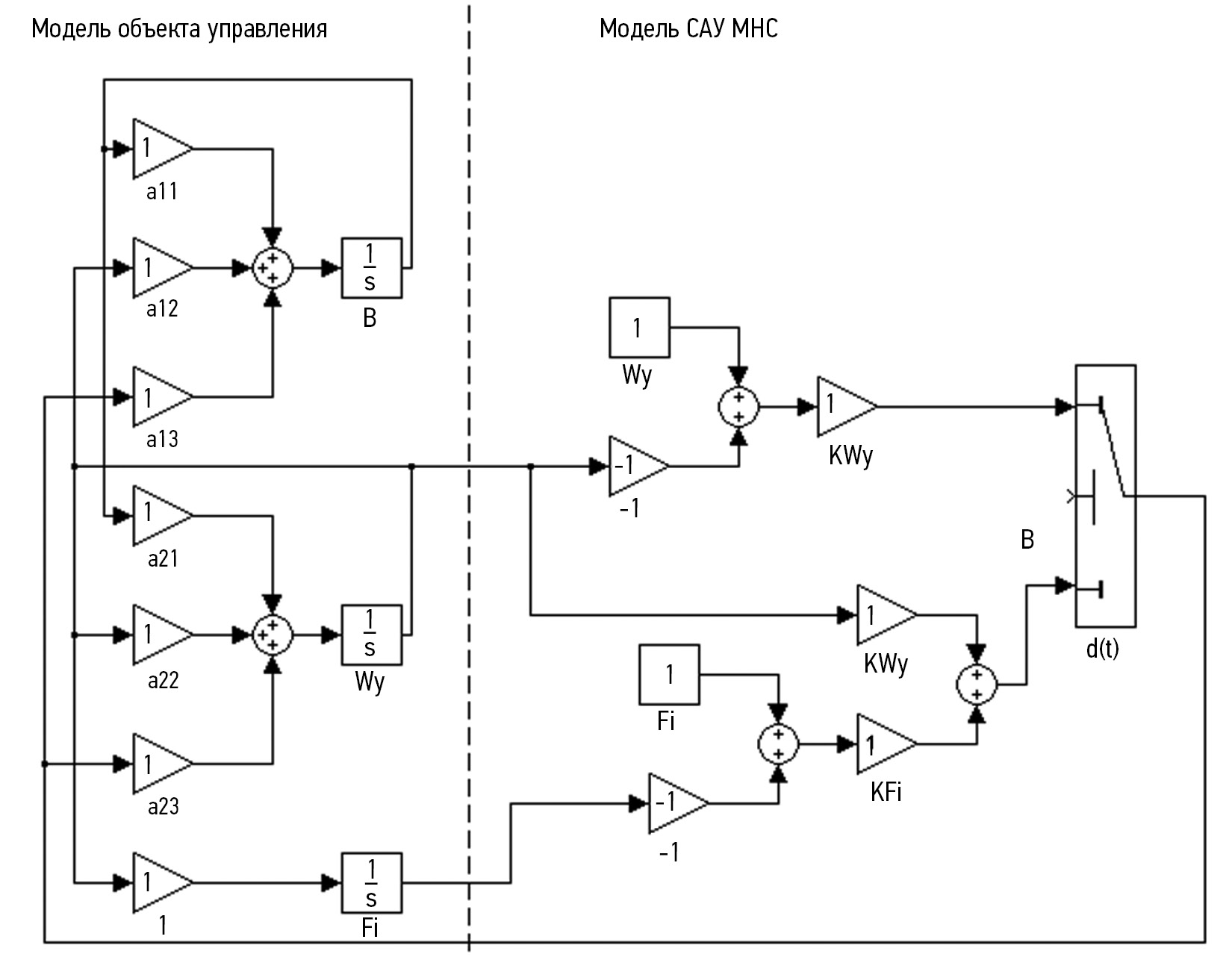 Если скорость БК задана постоянной, то для решения системы (4) в качестве источника информации о текущих значениях углов дрейфа и курса выбирают математическую модель объекта управления (рис. 7) [3].