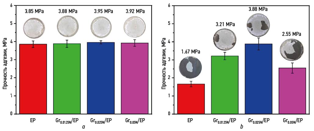 Кроме того, покрытия Gr/EP улучшают механические характеристики. Испытания на прочность сцепления показали, что графен эффективно влияет на степень отслоения покрытия после длительного пребывания в агрессивной среде. Наибольшая прочность адгезии до 3,88 МПа у покрытий Gr 0,025 % /EP обеспечивает его возможность надежно сохранять связь с металлической подложкой даже в экстремальных условиях.