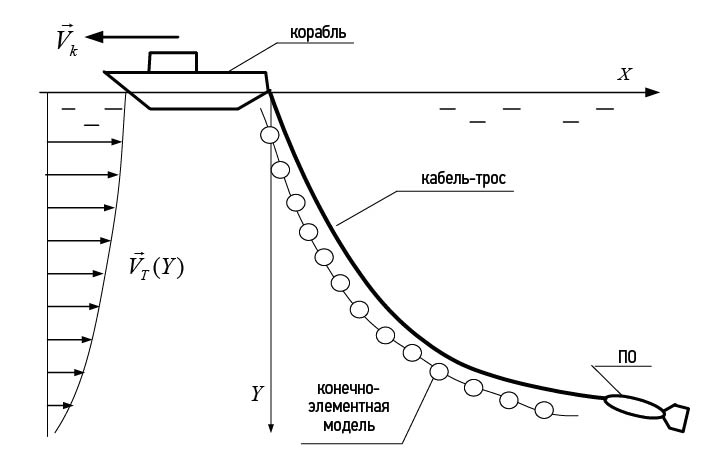 Корабль буксирует ПО заданной формы и отрицательной плавучести p0 на гибком кабель-тросе. Заданы характеристики кабель-троса: диаметр d*, отрицательная плавучесть погонного метра p*. Буксировка осуществляется по прямой с постоянной скоростью Vk с глубиной H погружения ПО. Требуется определить необходимую длину кабель-троса, его конфигурацию и положение ПО по отношению к кораблю (см. рис. 1). Профиль течения (функция VT(Y)) и скорость буксировки Vk известны.