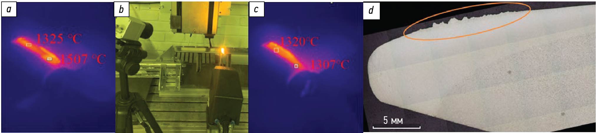 С помощью инфракрасной камеры было установлено, что оплавление появляется, когда температура нагрева на поверхности превышает 1400 °C. Наибольшая вероятность оплавления локализуется в зоне совместного действия источников нагрева на спинке, на расстоянии 10–15 мм от входной кромки (рис. 6, d).