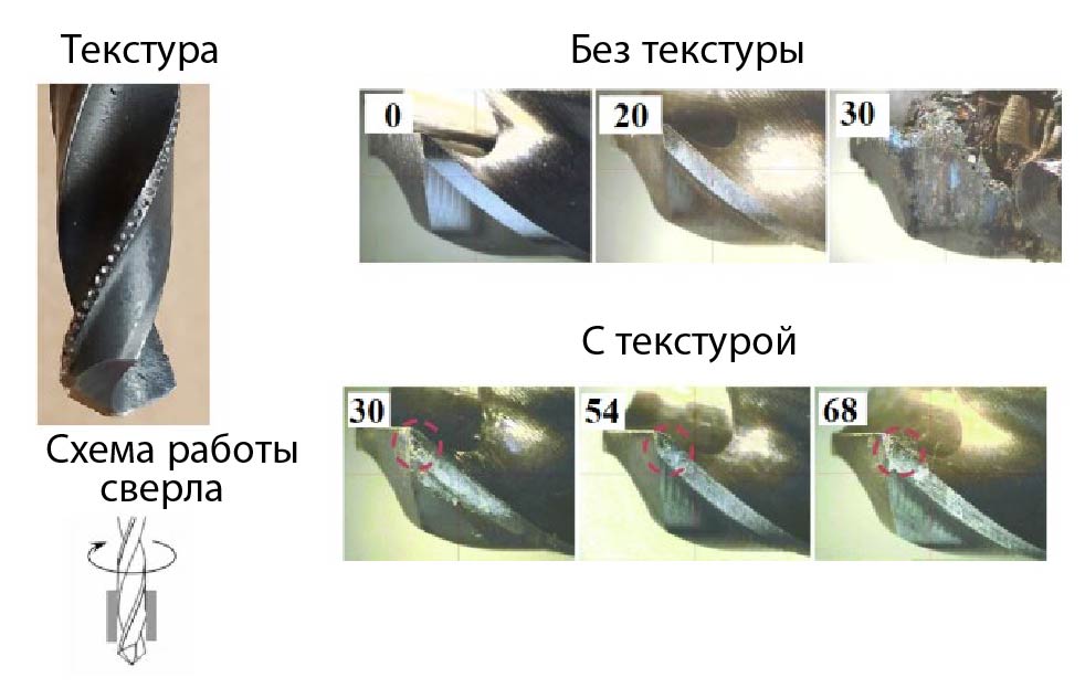 CONCLUSIONS: The textured tool was found to be more effective than the non-textured one. The study showed that the main methods allowing to improve the performance of drilling tools with microtextured surfaces are the contact length reduction, the wear debris capturing, and lubrication micro-layering in the cutting mode. The study will be useful for further development of this subject.