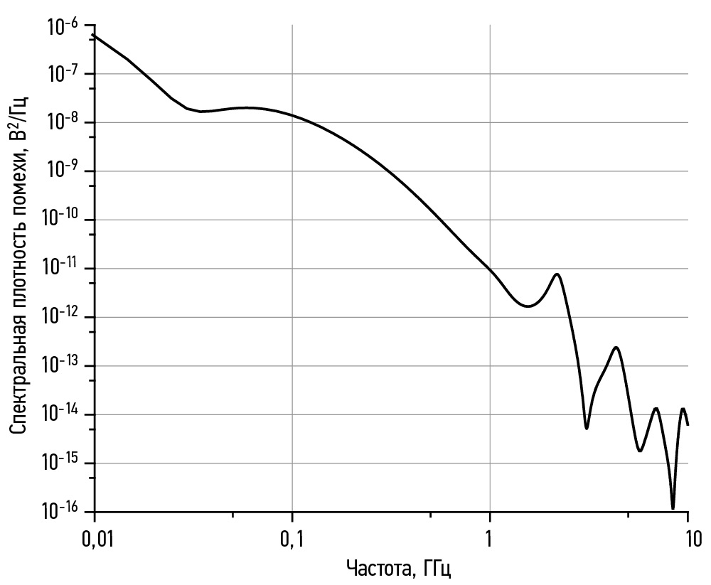 где t — время, выраженное в наносекундах. На рис. 2 показана спектральная плотность тока (5), полученная с помощью быстрого преобразования Фурье с шагом по времени τ = 0,05 нс и числом отсчетов N = 4096.