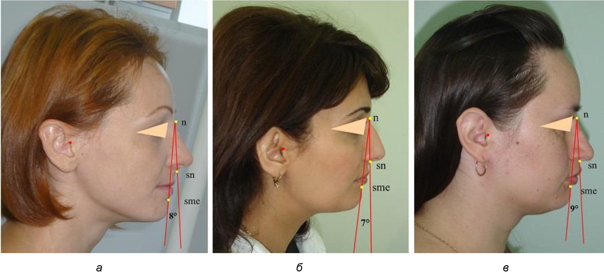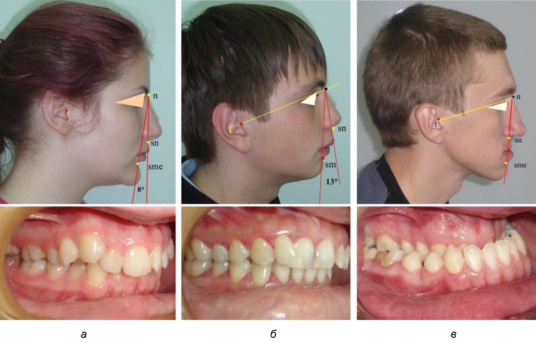 Рис. 4. Параметры лицевого межгнатического угла при нормопозиции (а), антепозиции (б) и ретропозиции (в) гнатического отдела лица