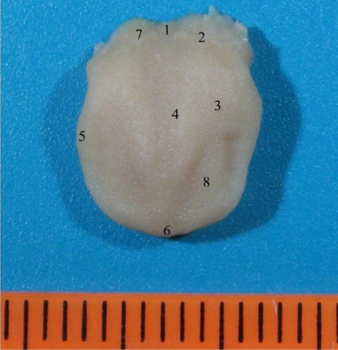 Рис. 2. Макропрепарат языка плода человека. Возраст – 17 недель, пол женский: 1 – слепое отверстие языка; 2 – пограничная борозда языка; 3 – спинка, предбороздовая часть тела языка; 4 – срединная борозда языка; 5 – край языка; 6 – верхушка языка; 7 – желобоватые сосочки языка; 8 – конусовидные, нитевидные, грибовидные сосочки языка