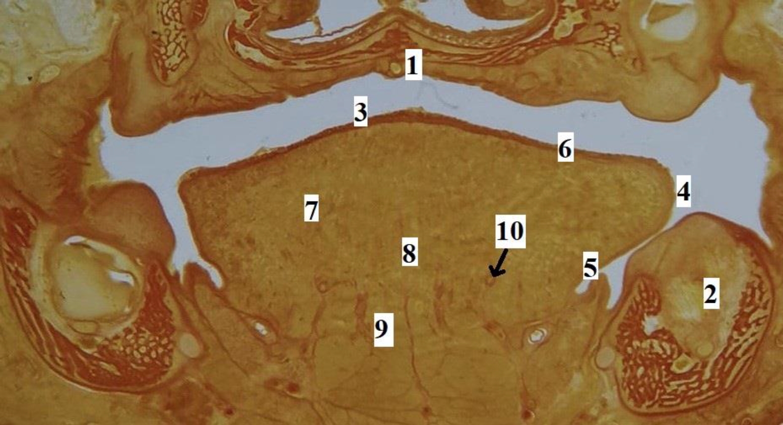 Рис. 3. Язык плода человека. Фронтальная гистотопограмма. Фото под микроскопом MicroOptix MX-1150, ок. ×10, об. 1. Возраст – 22 недели, пол мужской. Окраска по Ван – Гизону: 1 – твердое нёбо; 2 – нижняя челюсть; 3 – спинка языка; 4 – край языка; 5 – эпителий слизистой оболочки нижней поверхности языка; 6 – специализированный эпителий спинки языка; 7 – мышечные волокна поперечной мышцы языка; 8 – перегородка языка; 9 – мышечные волокна подбородочно-язычной мышцы; 10 – глубокая артерия языка