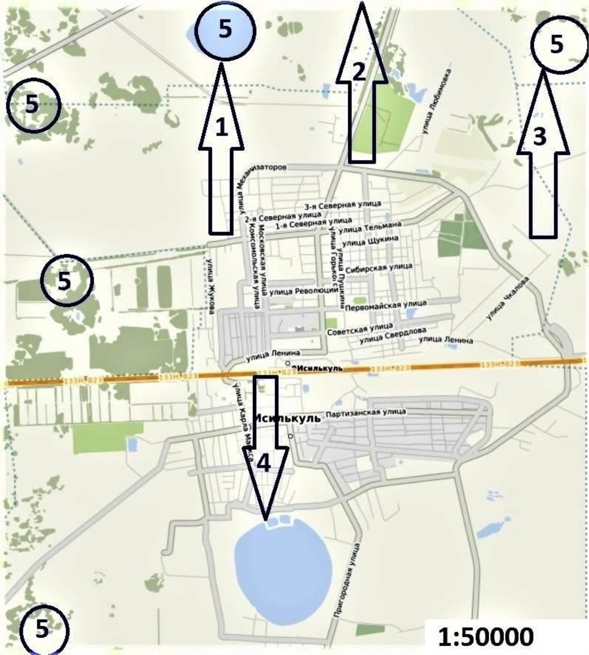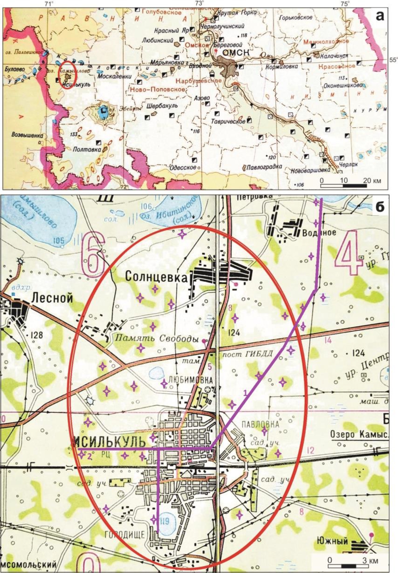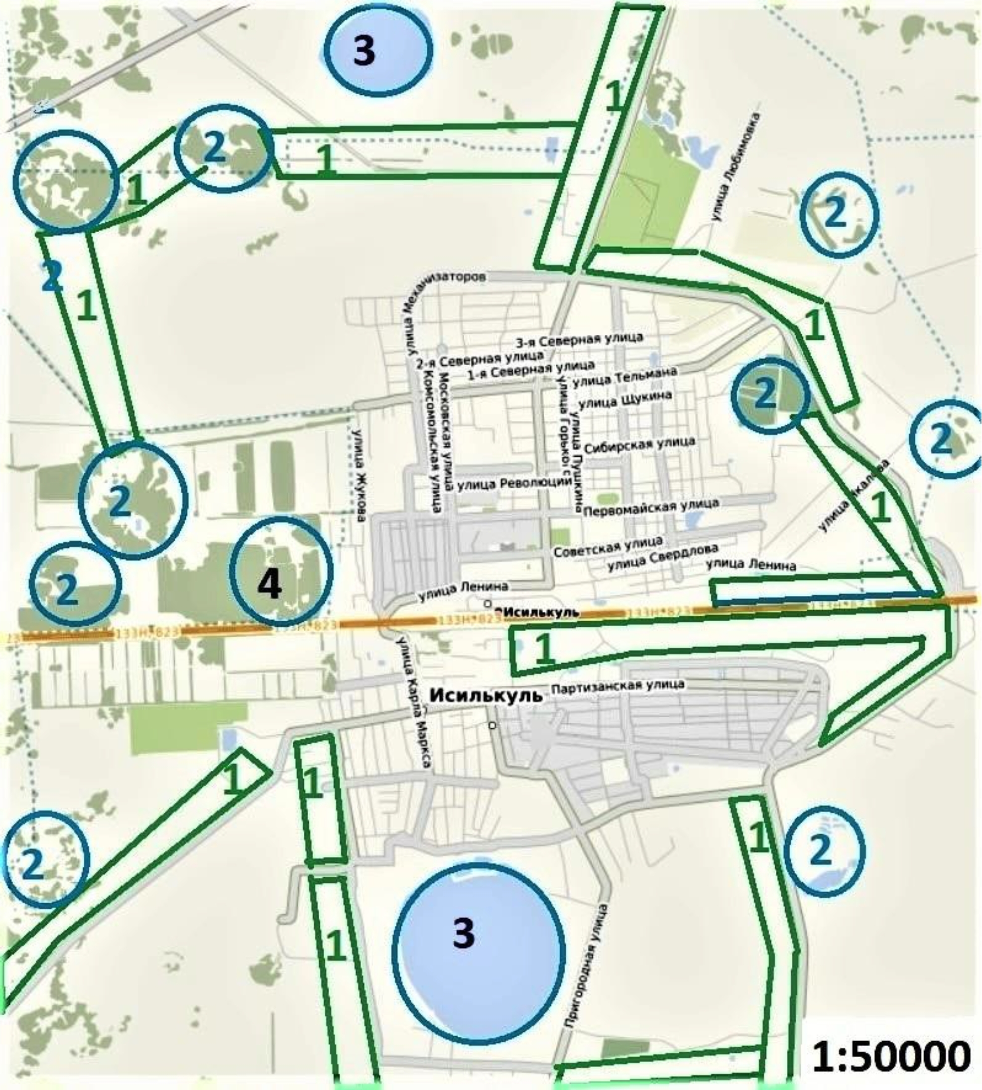 Территория объекта исследования находится в центральной части восточной половины Ишимской равнины и образует в плане эллипс, вытянутый с севера на юг (Рис. 1). В границах объекта исследований расположены Исилькуль с пригородами, частично земли сельских поселений Исилькульского административного района - Солнцевское, Боевое, Лесное. На севере, в район исследования входит фрагмент территории урочища Камышловский лог, на юге – котловина оз. Городище. Согласно кадастровой карте в Исилькульском районе на долю сельскохозяйственных угодий приходится 51.1%. Порядка 13% площади занимают земли лесного фонда. Остальная часть территории распределена между землями населенных пунктов и водного фонда, а также земель производственного и специального назначения. Бросовые земли, порядка 10-15% от всей территории района, большей частью, отнесены к фонду государственного запаса. Они заняты пустырями, оврагами, болотами и солончаками