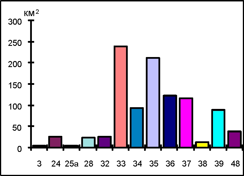 Рисунок 2. Распределение площадей, занятых различными ландшафтами в Ишимской равнине [Большаник, 1996].