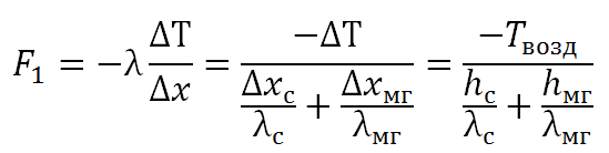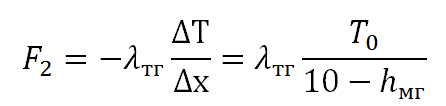 Тепловой поток выражается по закону Фурье через градиент температуры и теплопроводность как F=- λ (grad T). Таким образом, тепловой поток от фронта промерзания в атмосферу через комбинацию из двух сред (снег и мерзлый грунт) согласно данным справочника [Михеев, 1977] может быть записан как: