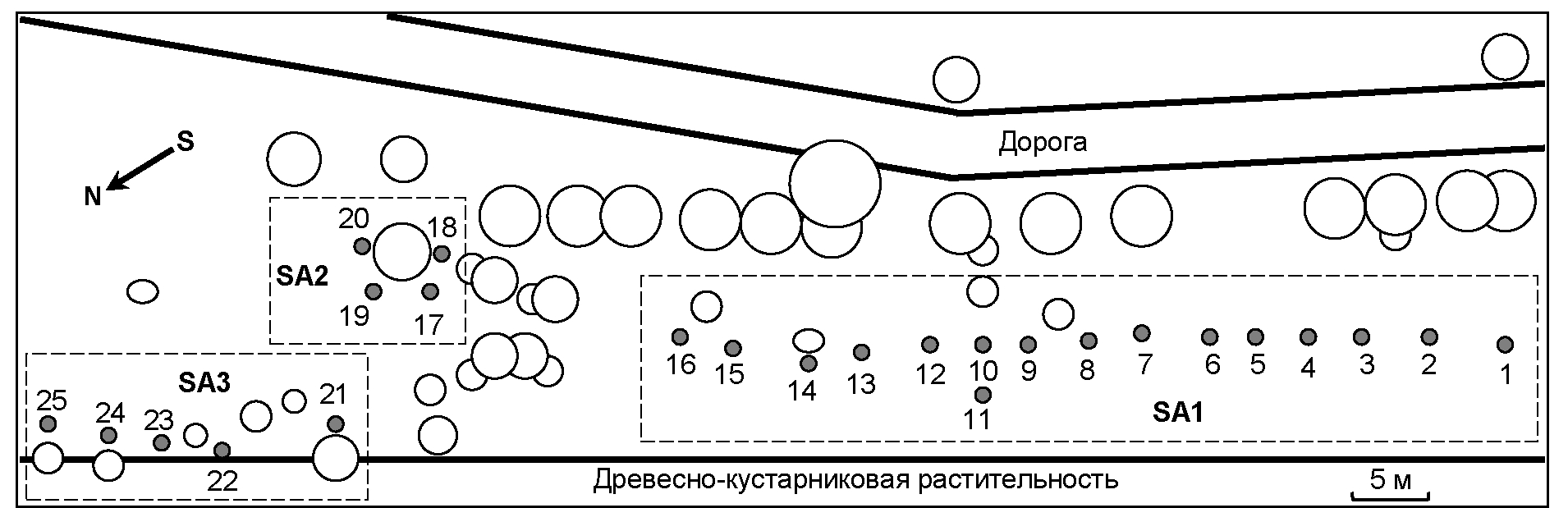 Объектом исследования были выбраны трехлетние саженцы H. odorata. Саженцы были высажены в середине января 2020 в ходе лесовосстановительных мероприятий на расчищенном от кустарниковой растительности участке леса (11.41530° с.ш., 107.42460° в.д.). Для наблюдений были отобраны 25 саженцев. Средняя высота саженцев на момент посадки составляла 110.0 ± 0.5 см (Стандартное отклонение SD = 14.4 см), а их средний диаметр на высоте ~ 10 см - 8.3 ± 0.1 мм (SD = 0.6 мм). По условиям освещенности участка и месторасположения саженцев относительно произрастающей здесь растительности, участок был разделен на три экспериментальные площадки (SA1, SA2, SA3), рис. 1.