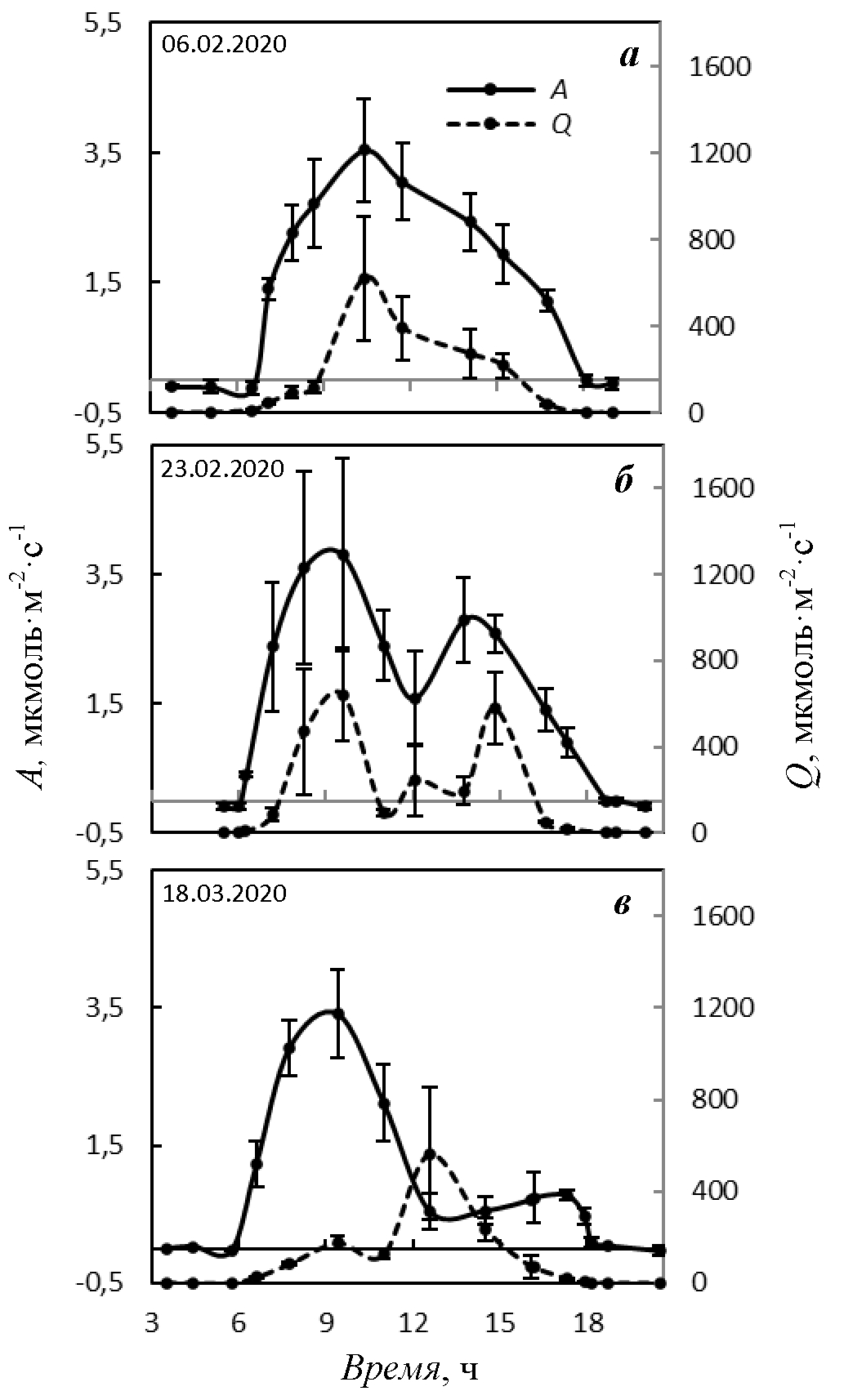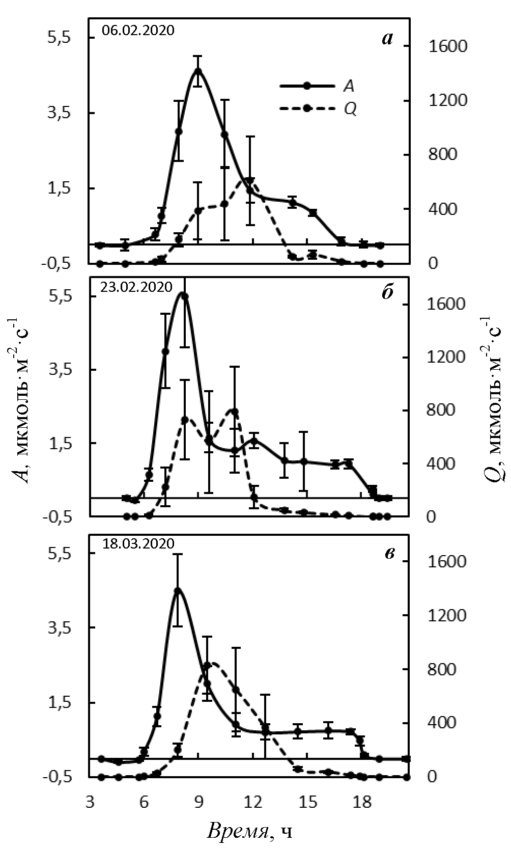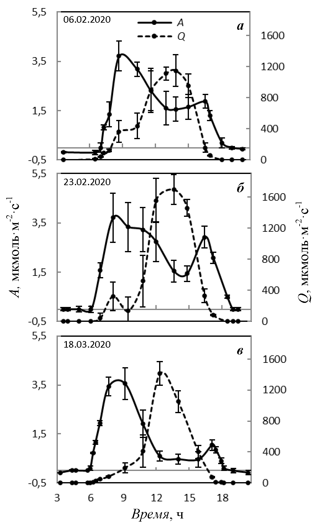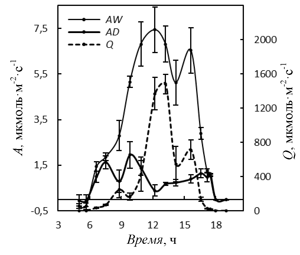 Рисунок 5. Суточная динамика интенсивности фотосинтеза, A, и ФАР, Q, саженцев, произрастающих на площадке SA3. Планки на графиках отображают величины SD.