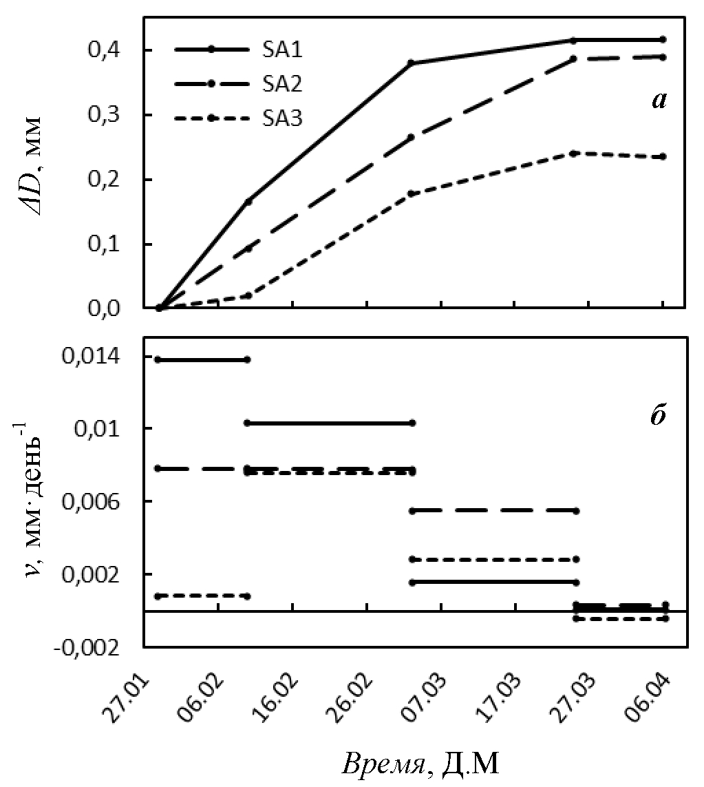При сопоставлении динамики прироста исследуемых саженцев по толщине (рис. 8) с динамикой влажности почвы (рис. 2) видно, что с уменьшением влажности почвы прирост также уменьшается. Действительно, наибольшие приросты ствола наблюдались в первое время после посадки саженцев, до 10.02, за исключением саженцев на площадке SA3, прирост которых был незначительным. Далее, вплоть до 03.03 поддерживались относительно неплохие темпы прироста. В дальнейшем наблюдалась тенденция к уменьшению прироста, и в период с 25.03 по 06.04 прирост практически прекратился, вплоть до отрицательной величины, наблюдаемой у растений на площадке SA3, что было связано, по-видимому, с некоторой усушкой древесины. Саженцы на площадке SA2 c 03.03 характеризовались несколько лучшими показателями прироста (рис. 8 (б)) и, соответственно, биомассы.