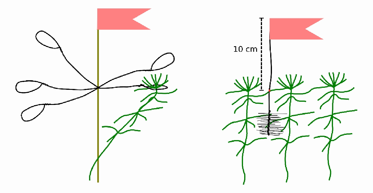 Для измерения скорости линейного прироста использовали классический метод меток: для прямостоячих видов сфагнума (Sphagnum fuscum, S. divum, S. papillosum, S. capillifolium) использовали ершики, для наклонно растущих и плавающих видов (S. majus, S. jensenii, S. balticum, S. angustifolium) проволочные кольца (рис. 1). Ершики изготавливались вручную из инертной проволоки (садовая проволока в пластиковой оплетке), которая скручивалась с леской для получения «ершика» и в верхней части помечалась флажком. В нижней трети ершика закреплялась метка, относительно которой измерялся рост сфагнума вверх. Ершики устанавливались в среднем по 10 штук на площадке в радиусе 50 см, так чтобы охватить вариацию в микрорельефе площадки. Проволочные петли скручивали из той же проволоки, затем объединяли по 5 штук на колышек, который также помечался флажком. Два колышка (каждый по 5 петель) устанавливались на площадку на расстоянии 50 см друг от друга.