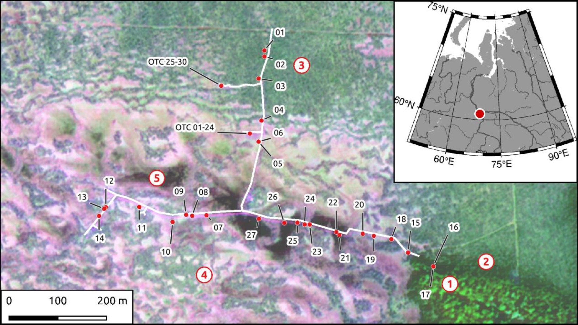 Для измерения прироста разных видов сфагнума заложено 27 площадок так, что каждый вид сфагнума измерялся на 2-3 площадках, чтобы охватить пространственную вариацию (рис. 2). Все площадки заложены в радиусе 500 м вдоль мостков стационара Мухрино (координата центра расположения площадок 60.89190N, 68.68222E) [Dyukarev et al., 2021]. На каждой площадке была снята координата с помощью GPS и один раз (осенью 2019 года) измерен уровень болотных вод (измерения проводили в 3х точках на площадке, и записывалось среднее значение, общее для всей площадки).