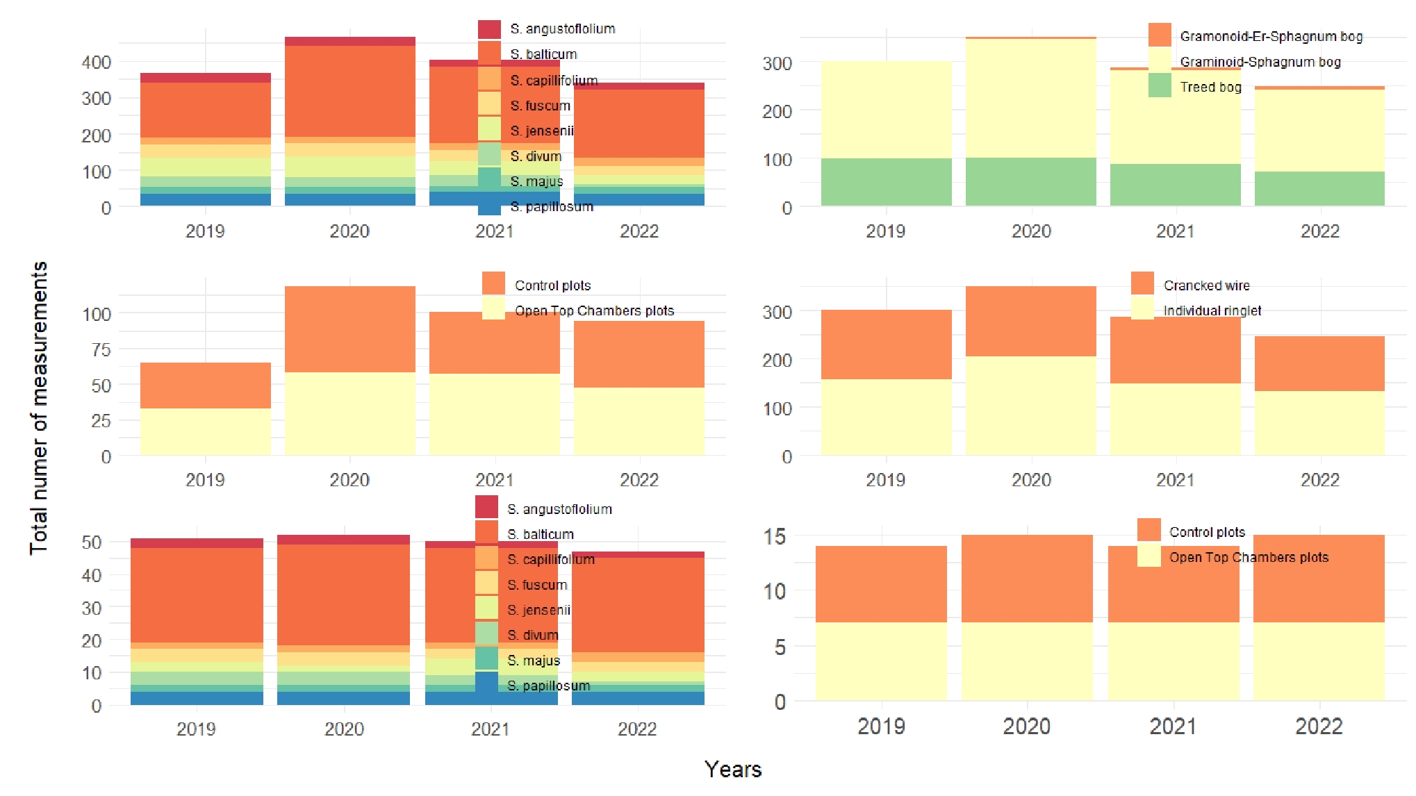 Всего в течении четырех лет проведено 1574 измерения линейного прироста. Из них 539 измерений выполнено методом ершиков и 1035 – методом индивидуальных колец. По годам количество измерений распределялось равномерно и варьировало в зависимости от числа сохранившихся меток, всего в 2019 году проведено 365 измерений, в 2020 – 467, в 2021 – 402, в 2022 – 340 измерений. По типам местообитаний, всего в топях сделано 461 измерение, в рямах – 357 измерений. Выполнены измерения восьми видов, в том числе: Sphagnum angustifolium – 89 измерений, S. balticum – 796, S. capillifoium – 83, S. fuscum – 125, S. jensenii – 175, S. divum – 95, S. majus – 68, S. papillosum – 143 измерения. В рамках эксперимента по искусственному изменению температуры с помощью камер с открытым верхом (OTC), всего было выполнено 378 измерений, из них 183 в контроле и 195 внутри камер (все измерения проводились на одном виде сфагнума – S. balticum). Измерение первичной продукции выполнено на 200 образцах, из которых около половины выполнена в рамках эксперимента по изменению температуры. Визуализация структуры полученных данных представлена в виде столбиковых диаграмм (рис. 3).