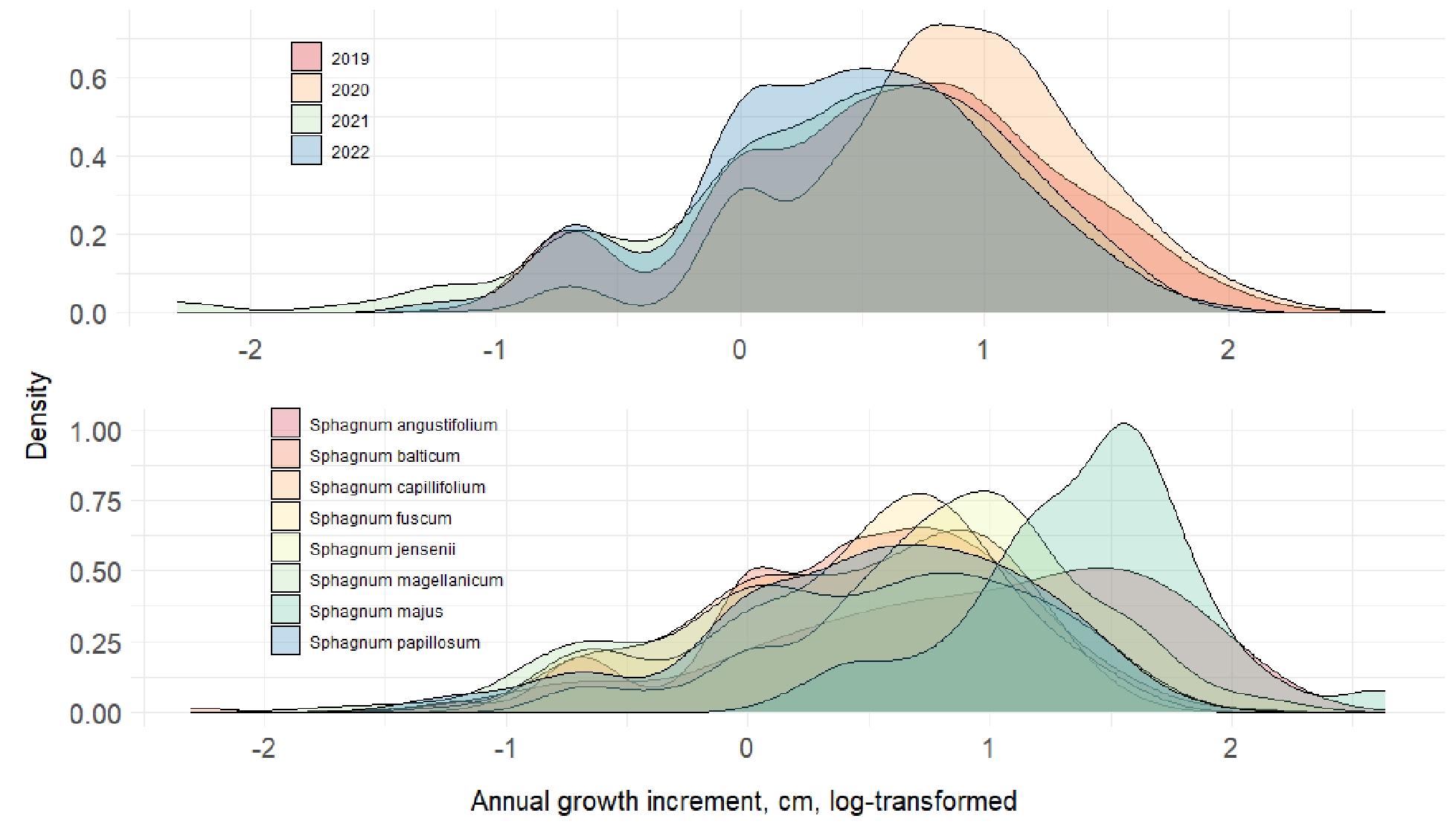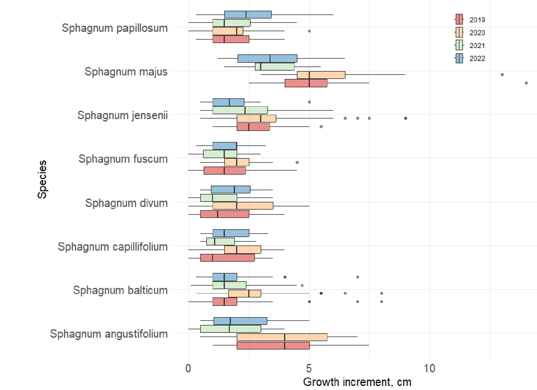 10. Figure 5. Boxplots (geom_boxplot, ggplot) showing differences in growth between sphagnum species and by year, at the Mukhrino station sites over a four-year monitoring period.