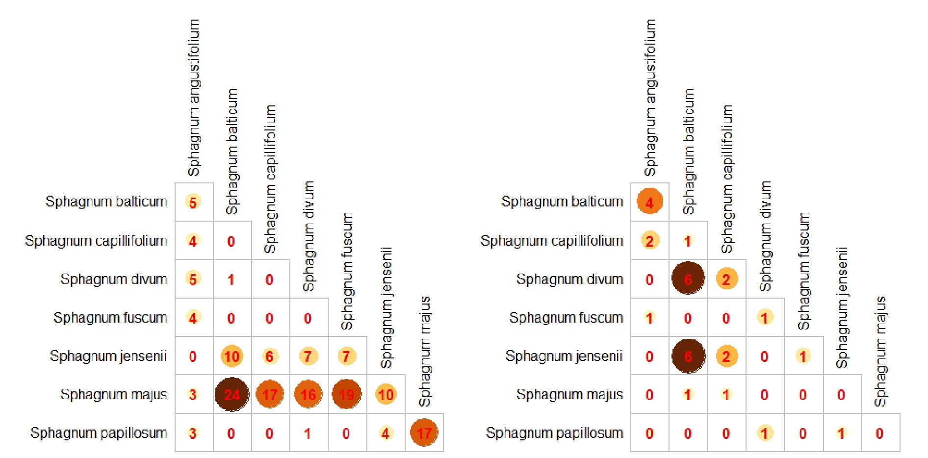 12. Figure 7. Matrices of differences in linear growth of different sphagnum species constructed using the Wilcoxon test, p-values ​​were transformed (-log10) to show the difference, 0 – non-significant difference.