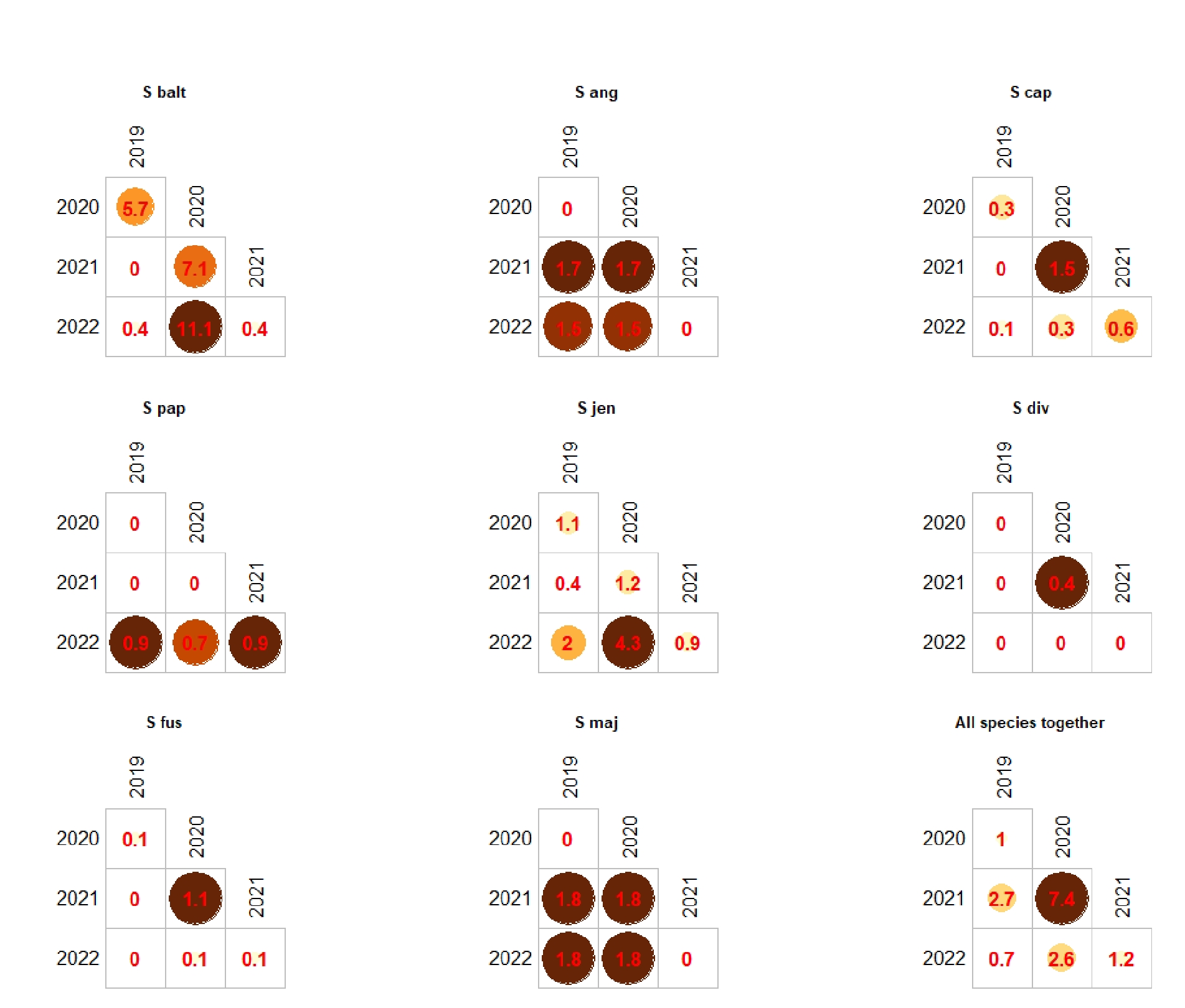9. Figure 4. Scatter plots (geom_density, ggplot) by year (top) and by species (bottom) at the Mukhrino station sites over a four-year monitoring period.