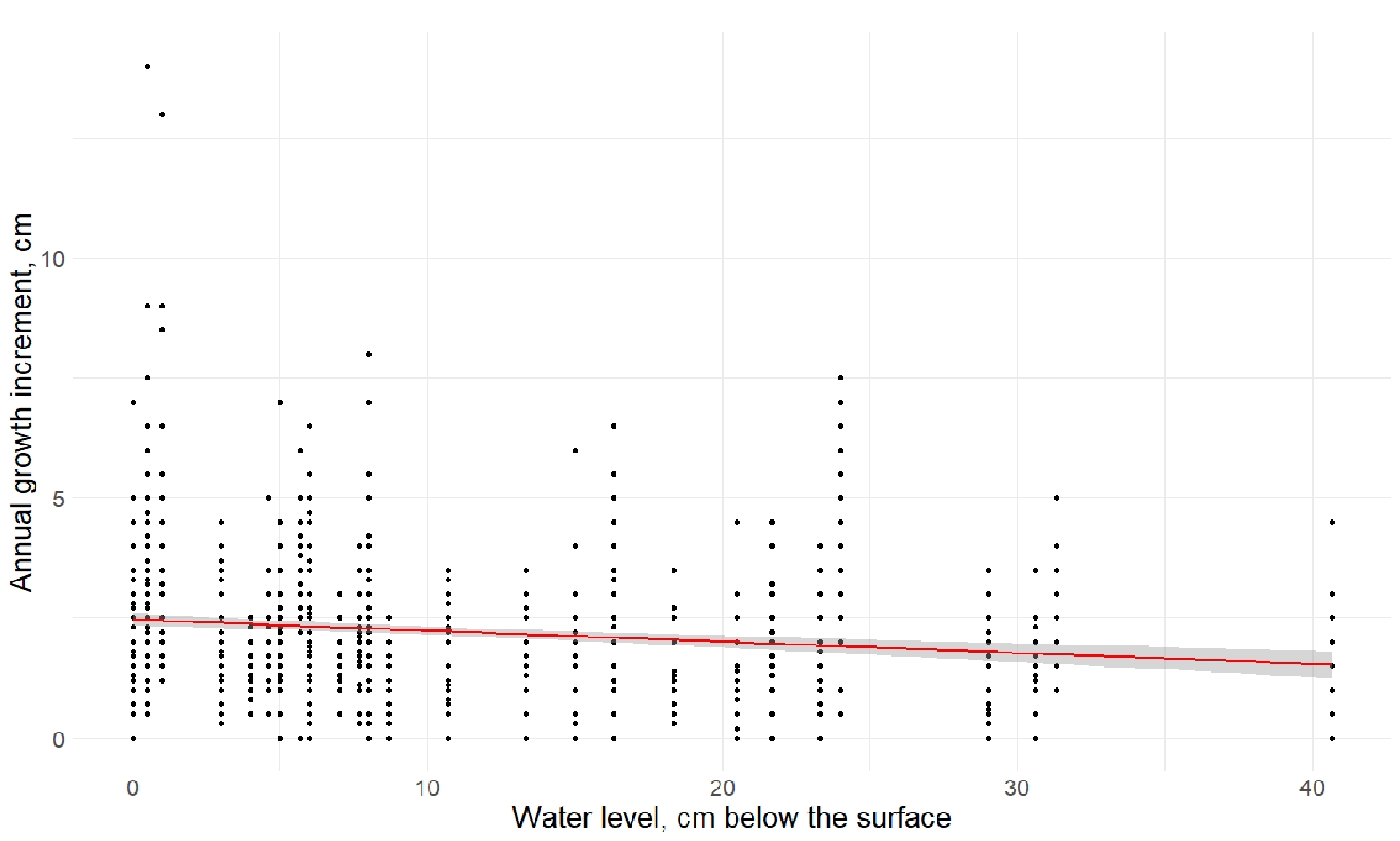 - Избыточное увлажнение и высокий стабильный уровень болотных вод имеют положительное влияние на линейный прирост и первичную продукцию для всех видов сфагнума (и наоборот, периодическая засуха и понижение уровня болотных вод ведут к замедлению роста) [Clymo, 1973; Hayward and Clymo, 1983; Loisel, 2012; Gaudig et al., 2017; McNeil and Waddington, 2003; Bengtsson et al., 2020; Gaudig et al., 2020].