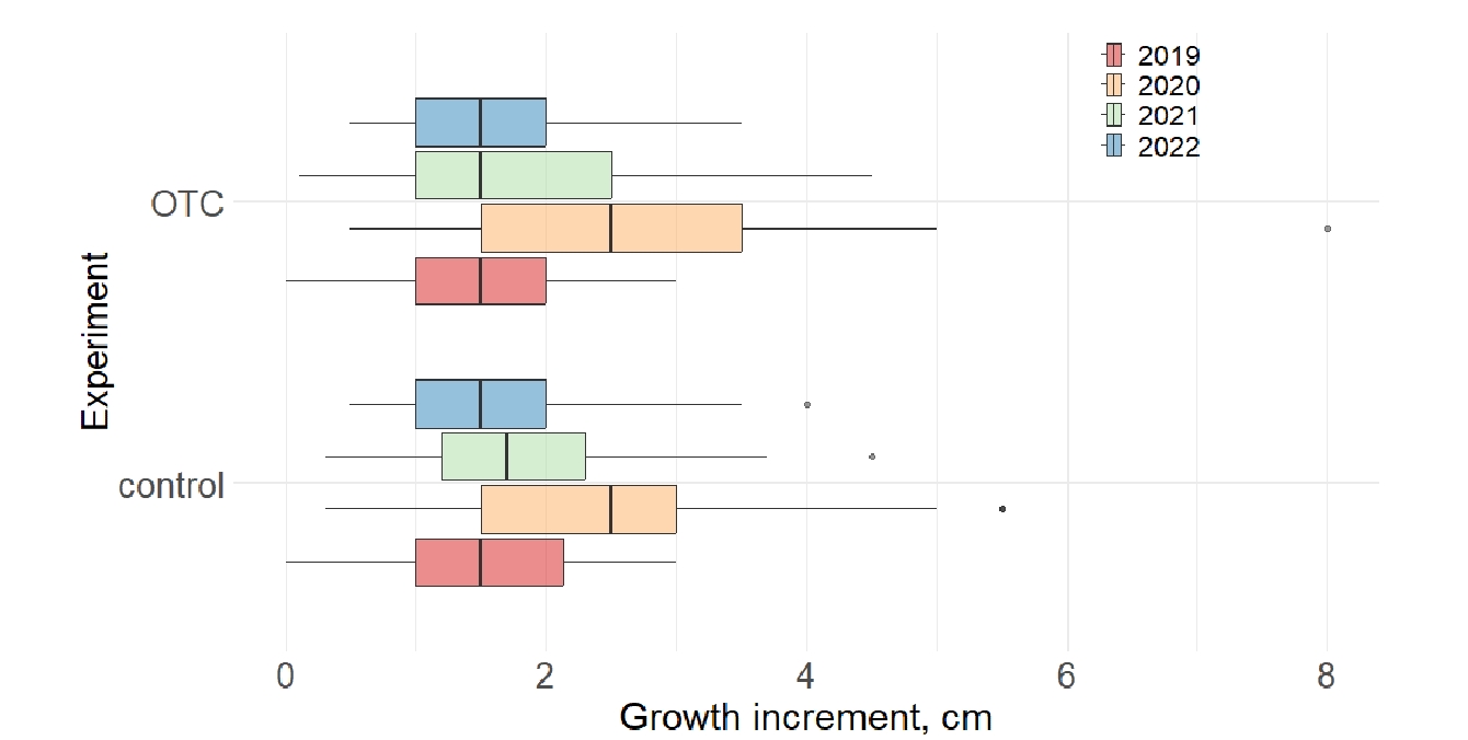 3. Множественный дисперсионный анализ показал влияние нескольких факторов на значения годичного прироста: имеют значение видовая принадлежность, год, местообитание и уровень болотных вод. Эксперимент с OTC не показал значимых изменений в приросте. Каждый из факторов проанализирован с помощью статистических анализов и визуализации в графиках показаны общие тенденции.