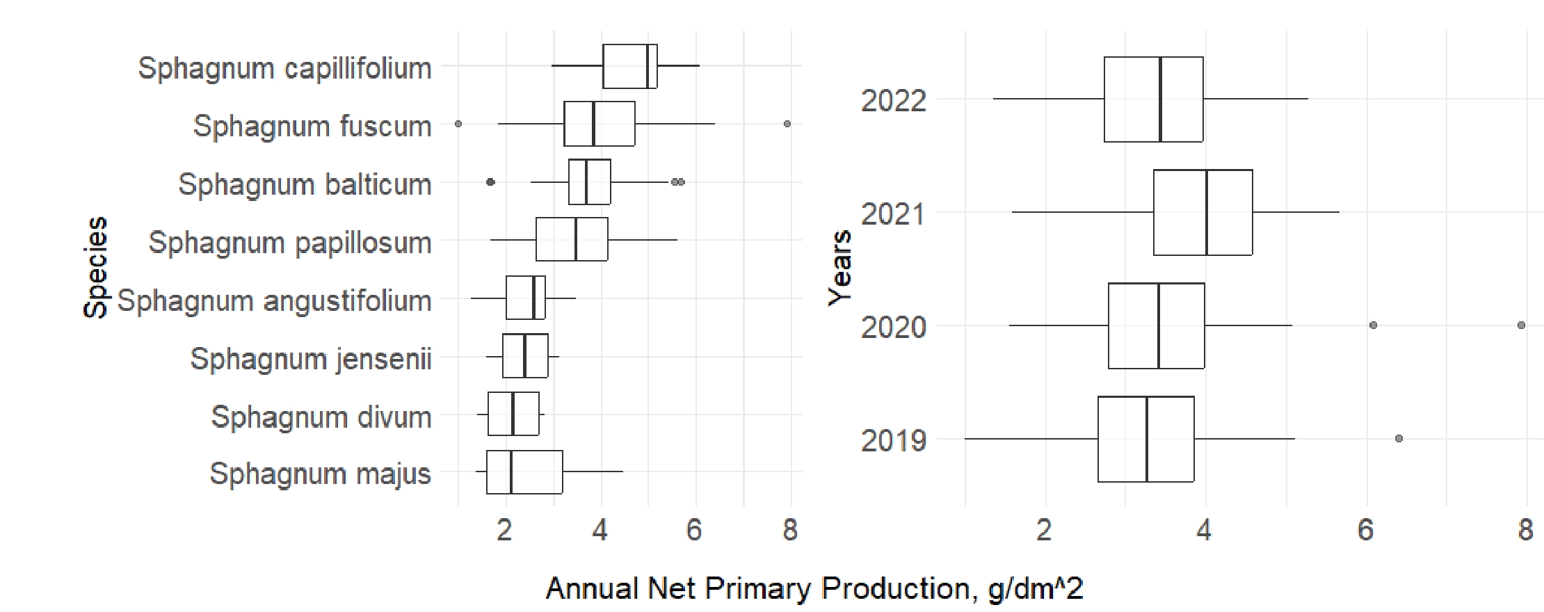 The following results were estimated during the study. The linear growth increment of eight species of Sphagnum varied from 1.6 to 3 (mean between species 2.1) cm per year. The species in ascending order of annual growth: S. divum (1.6 cm per year), S. fuscum (1.7), S. capillifolium (1.7), S. papillosum (1.9), S. jensenii (2.7), S. angustifolium (3), S. majus (4.5 cm per year). The annual primary production varied from 1.2 to 3.7 (mean between species 2.3) g/dm2. The species in ascending order of annual primary production: S. divum (1.2 g/dm2 per year), S. papillosum (2.1), S. fuscum (2.1), S. jensenii (2.2), S. angustifolium (2.2), S. balticum (2.3), S. capillifolium (2.5), S. majus (3.7). There are statistically significant differences in annual growth increments and primary production between some species, while others are the same. The specific year has significant influence on growth increment and primary production on average for Sphagnum species, but different species have positive or negative impact. There is statistically significant correlation between bog water level and growth increment for four species: two species with positive impact and two species with negative impact. When averaged for two habitats (treed bogs and Sphagnum lawns), the annual growth increments statistically differ, while the primary production is the same. There wasn’t statistical effect of raised temperature (Open Top Chambers) on Sphagnum linear growth.