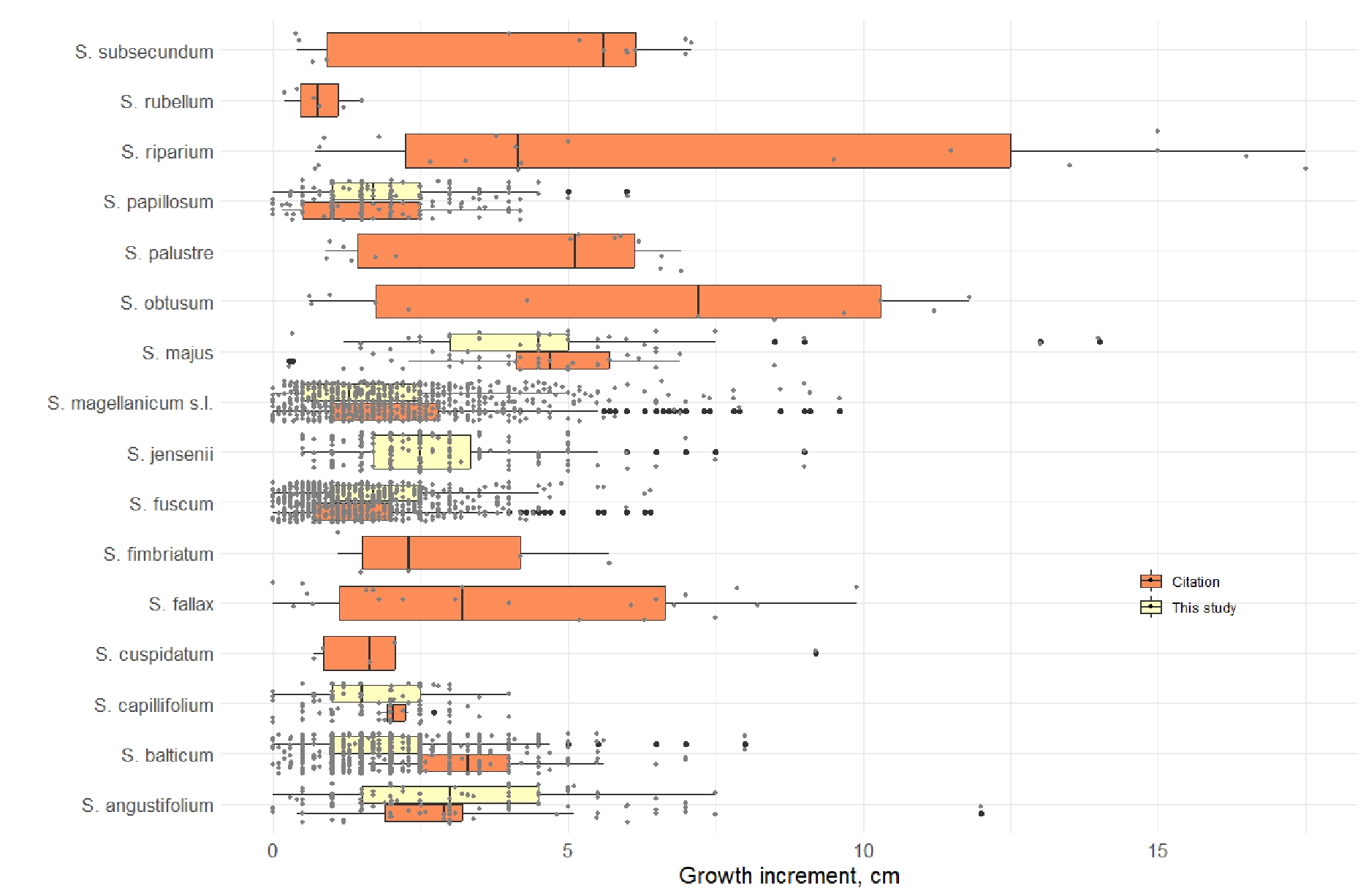 Мы сравнивали литературные данные с нашими данными о линейном приросте (рис. 11). С помощью Т-критерия Вилкоксона показано, что у трех видов наблюдаются достоверные различия (при 5% уровне значимости) между измеренным нами приростом, и литературными данными: S. balticum и S. divum в нашем исследовании имеют меньший прирост, S. fuscum несколько больший. Однако, сравнение с глобальными трендами не входило в задачи настоящего исследования, поскольку требует большей работы с качеством исходных данных и использование сложных статистических моделей (например, в работе Bengtsson et al., 2021]. В целом показано, что данные, полученные на Мухрино, не выбиваются из глобальных измерений.