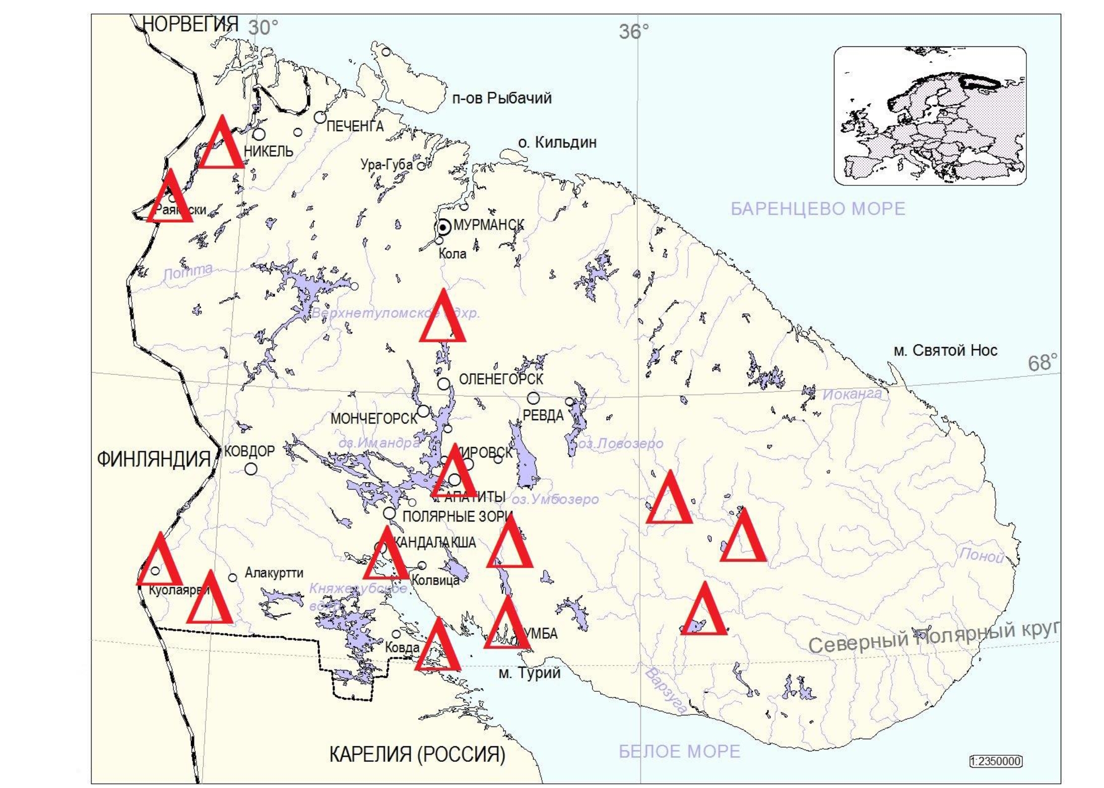 The Murmansk Region (66–70° N), located in the north-eastern corner of Russian Fennoscandia, is a part of the Atlantic-Arctic zone of temperate belt with a rather mild climate. The snow cover period extends from the middle of October until the end of May, and the thermal growing season from early June until the middle of September. The average amount of precipitation varies from 800 to 1200 mm in mountainous regions and from 500 to 800 mm in the greater part of the lowland area [Yakovlev 1961; Yakovlev, Kozlova 1971]. Murmansk Region is geomorphologically part of the Baltic Shield, and its topography generally becomes lower from northwest to southeast [Geologiya SSSR, 1958]. It contains the oldest rocks of the European continent which are mainly composed by granites and gneisses with local alkaline intrusions in its eastern part [Pozhilenko et al., 2002; Ivanyuk et al., 2008]. Two latitudinal vegetation zones can be distinguished: tundra and taiga [Ramenskaya 1983]. The taiga zone is divided into the transitional forest-tundra zone and the northern taiga [Chernov 1971].