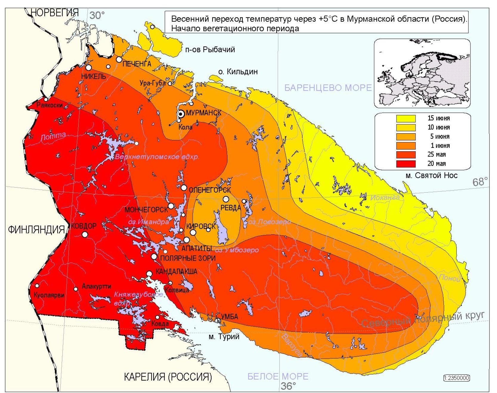 Вегетационный период рассматривали как число дней выше базовой температуры +5°C. Длина вегетационного периода контрастно отличается в разных районах области, имеет тенденцию к сокращению на восток-северо-восток и отражает расположение растительных зон в Мурманской области [Blinova, Chmielewski, 2015]. Начало вегетационного периода, обусловленное переходом средней суточной температуры воздуха через +5°C весной, хорошо согласуется с расположением зональной растительности. Поэтому для разграничения региона по теплообеспечению летом для упрощения использовали климатическую карту [Yakovlev, Kozlova, 1971] перехода средней суточной температуры воздуха через +5°C весной.