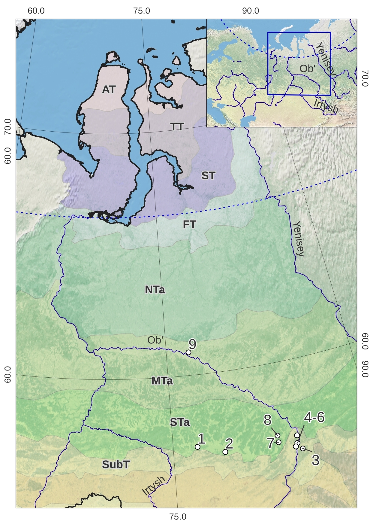Bioclimatic zones (according Il’ina et al., 1985): AT – Arctic tundra, TT – typical tundra, ST – South tundra, FT – forest-tundra, NTa – North taiga, MTa – Middle taiga, STa – Shouth taiga, SubT – Subtaiga.