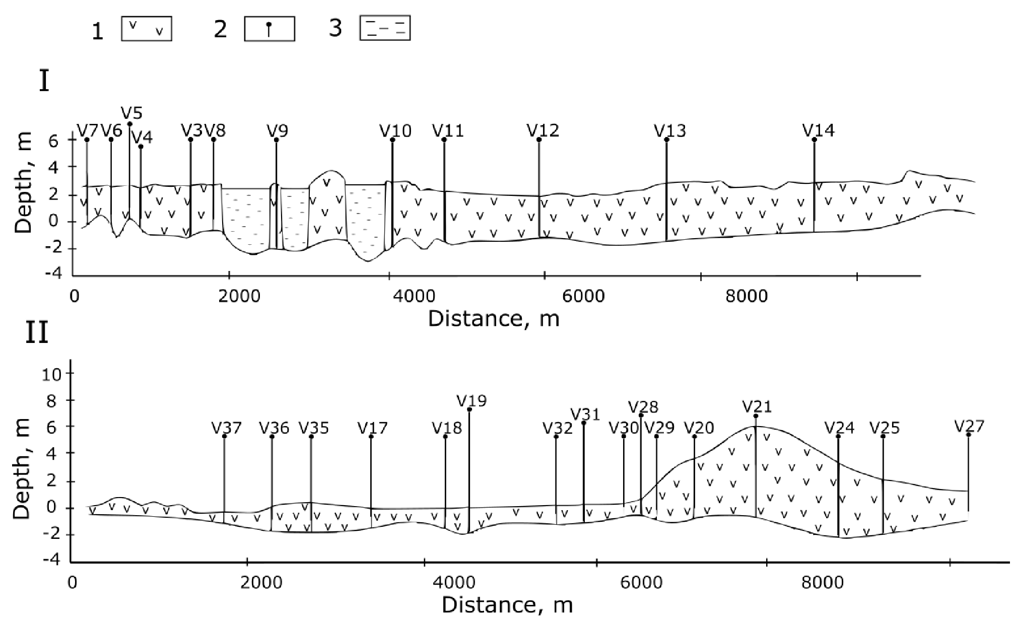 - The second stratigraphic type of peat deposit is characteristic of large (up to 7-10 km across) ancient flat-topped ombrotrophic mires in the axial part and along the southern margin of the GVB. The transverse profile showed the vast areas of the GVB, often adjacent to the bog of primary lake basins, were formed by mineral soils’ paludification of flat depressions with developed hydrophilic herbaceous vegetation (Fig. 2, I, V11-13). The peat accumulation began here later than in the lake depressions, at the beginning of the Atlantic period (about 8-8.5 ka BP).1
