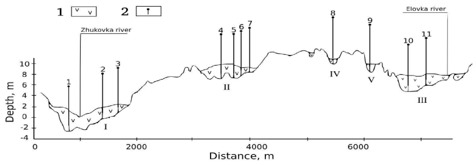 Peat mires (I-V) and numbers of peat cores (1-11). I – Zhukovskoe mire: 1 – Zh0; 2 – Zh1; 3 – Zh2; II – Kirgiznoye mire: 4 – Kir1; 5 – Kir2; 6 – Kir3; 7 – Kir4; III – Bolshoe Elovochnoe mire: 10 – E2; 11 – E1; IV – Elovochnoe mire-1: 8 – E4; V – Elovochnoe mire-2: 9 – E3.