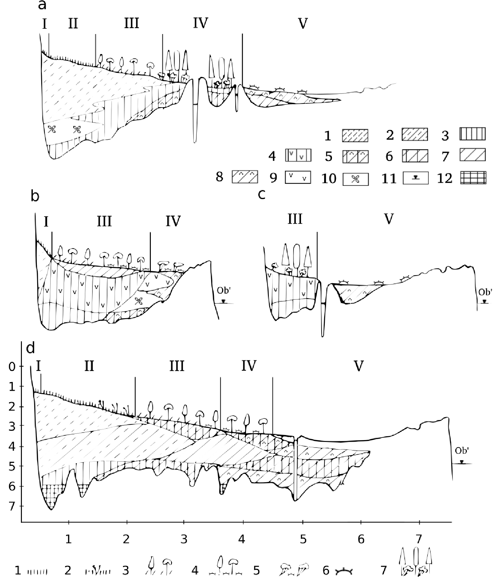 Floodplain segments: Podobinsky (a), Shegarsky (b, c); Desyatovsky (d). Zones of water-mineral nutrition: I – spring water, II – pressure-ground water, III – ground water, IV – mixed mire-river water, V – river water nutrition.