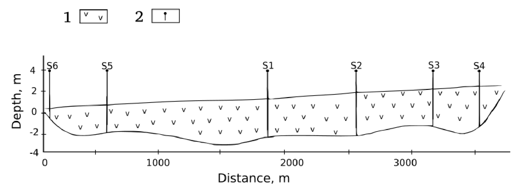 Legend: 1 – peat; 2 – drill locations with number; 3 – water.