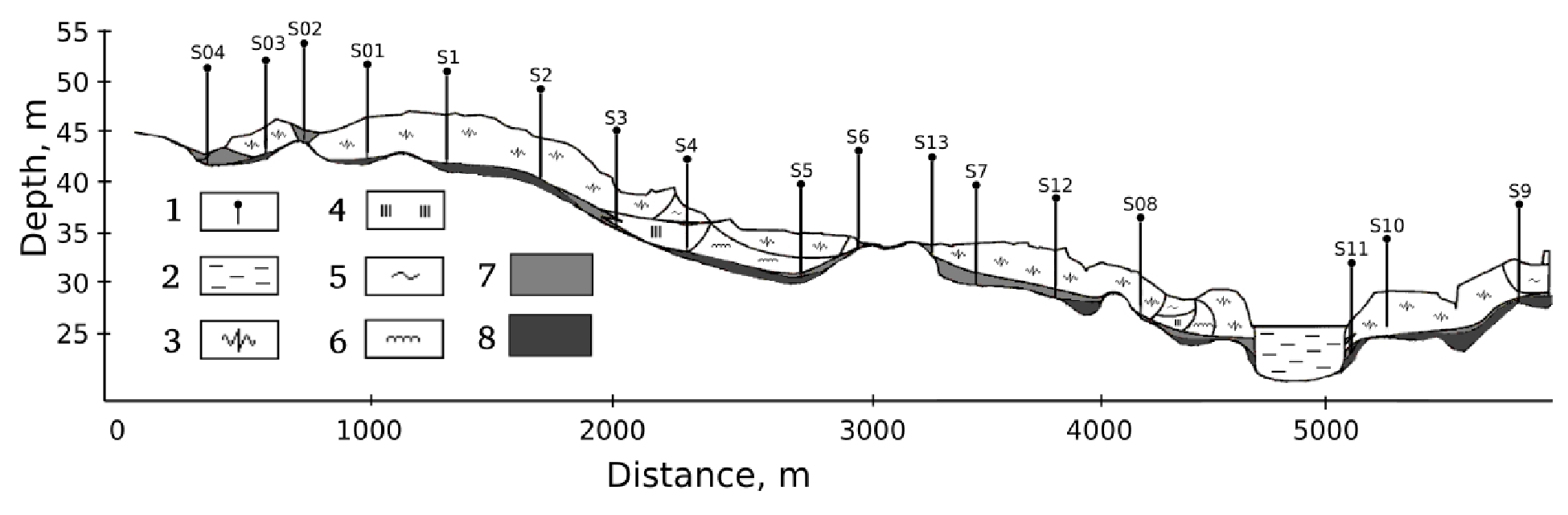 A simpler version of this peat stratigraphic type is presented on the shores swells of former lake basins on their southern side. The slight slope of the Vasyugan Plain and the constant inflow of surface waters from higher hypsometric levels of the Ob’-Irtysh watershed, provided a characteristic southern displacement of the peat deposits’ domes of oligotrophic ‘ryams’ to the north from their genetic centers (Figure 2, II, V21, V24).