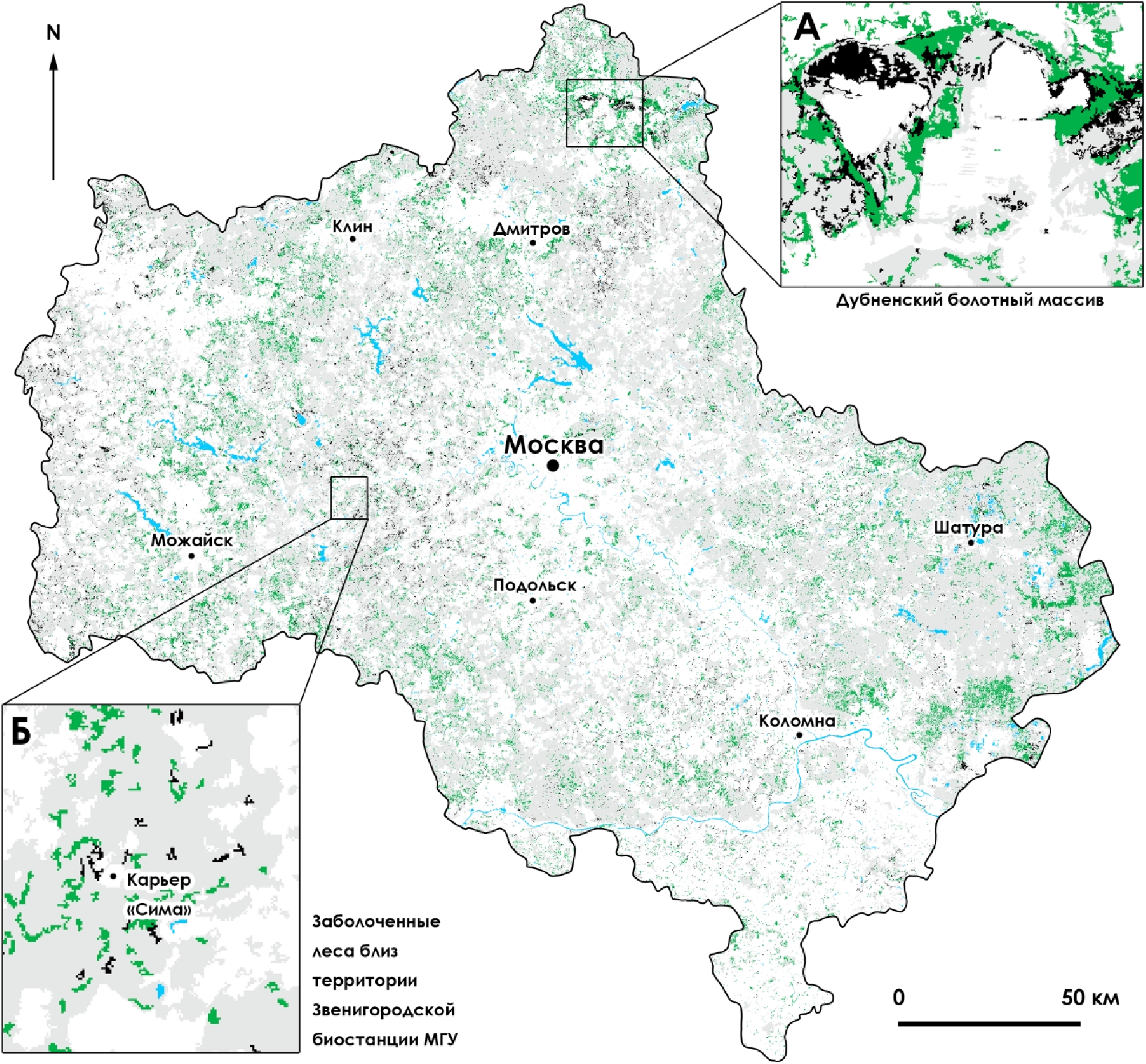 Заболоченные и слабо заболоченные леса, согласно полученной карте, являются «спутниками» распространения болотных экосистем и расположены в Московской области неравномерно: крупные площади обнаружены в северной (Дмитровский район) и восточной частях (Шатурский район) региона (рисунок 1а). Кроме того, заболоченные и слабо заболоченные леса часто представлены как избыточно увлажненные участки близ автоморфных лесов: площадь таких экосистем незначительна и редко превышает 10 га (рисунок 1б). Предположительно, основной причиной такого локального заболачивания являются особенности микрорельефа (как и в случае заболоченного леса «Дорохово», где были проведены измерения потоков парниковых газов), и подтопление в местах формирования ручьев и более мелких водотоков.