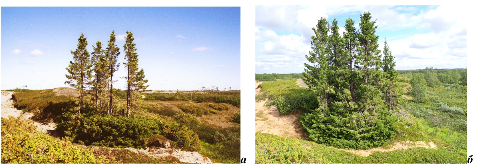 На территории Большеземельской и Малоземельской тундры ель обнаруживается существенно севернее границы леса, и севернее 68°с. ш., в рефугиумах – местах с благоприятными микроклиматическими и почвенно-грунтовыми условиями. Такие лесные островки на водоразделах тундры отмечали ещё советские геоботаники, изучающие взаимоотношения между лесом и тундрой [Yudin, 1954; 1956]. Происхождение их связано с теплым атлантическим временем голоцена (8-5 тыс. лет назад), когда ель росла на большей части восточноевропейских тундр. С началом cуббореального периода (⁓4.5 тыс. лет назад) произошел наиболее резкий сдвиг границы распространения хвойных деревьев к югу, обусловленный похолоданием и усилившейся нестабильностью климата. Однако изолированные популяции ели сохранились на территории тундры в рефугиумах. Существование ели в течение субатлантического (2.3 тыс. – 200 лет назад) и современного времени можно образно представить в виде локальных очагов, уменьшающих или увеличивающих свою площадь в зависимости от изменений климата. В периоды потеплений происходило расселение деревьев из рефугиумов в тундровые сообщества, а похолодания – их отмирание [Lavrinenko, Lavrinenko, 2003]. В рамках выполнения Международного проекта SPICE (2000-2003 гг.) было показано, что на северном пределе распространения в бассейнах рек Ортина, Море-Ю (Большеземельская тундра) и Нерута (Малоземельская тундра) ель сибирская существует как в форме небольших крайнесеверных островков, занимающих прежнее положение в рельефе со времен голоцена (на водоразделах), так и в виде более южных современных еловых редколесий, оккупировавших наиболее благоприятные местообитания в тундре (долины рек) в течение последних полутора столетий. Названные реки объединяет то, что они текут с юга на север через плато, сложенные мощной толщей песков, отложенных бореальной морской трансгрессией, имевшей место в Микулинское межледниковье, и переотложенных впоследствии ледником [Quaternary glaciations …, 1987; Development of landscapes …, 1993; Andreicheva, 2002]. Господство в этих районах песков, хорошо дренируемых и легко прогревающихся, является одним из основных экологических факторов, определяющих сохранение и распространение здесь деревьев. Кроме того, районы характеризуются холмисто-увалистым или рассеченным рельефом, и, следовательно, наличием склонов, дающих укрытие от холодных ветров. Различия в типе размножения, имеющие место в реликтовых островах и современных еловых редколесьях, обусловливают различия в форме их роста. Современные еловые редколесья в долинах рек по структуре древостоя подобны ельникам лесотундры. Для них характерно, преимущественно, семенное возобновление ели, о чем говорит наличие проростков и разновозрастного подроста. Реликтовые островки представляют собой сближенные группы тонкоствольных деревьев, занимающих возвышенные элементы рельефа на песчаных обнажениях водоразделов – бугры в центральных частях котловин выдувания и внешние части их бортов. Такие деревца, часто имеющие юбочную форму роста, объединены общей корневой системой и представляют собой клоны, образовавшиеся путем вегетативного размножения [Lavrinenko, Lavrinenko, 2004a]. Возраст отдельных стволов диаметром 4.5-6.0 см составляет 60-70 лет, а возраст всей группы может, по-видимому, достигать нескольких сотен лет [Lavrinenko, Lavrinenko, 2003]. Наличие бугров с еловыми 