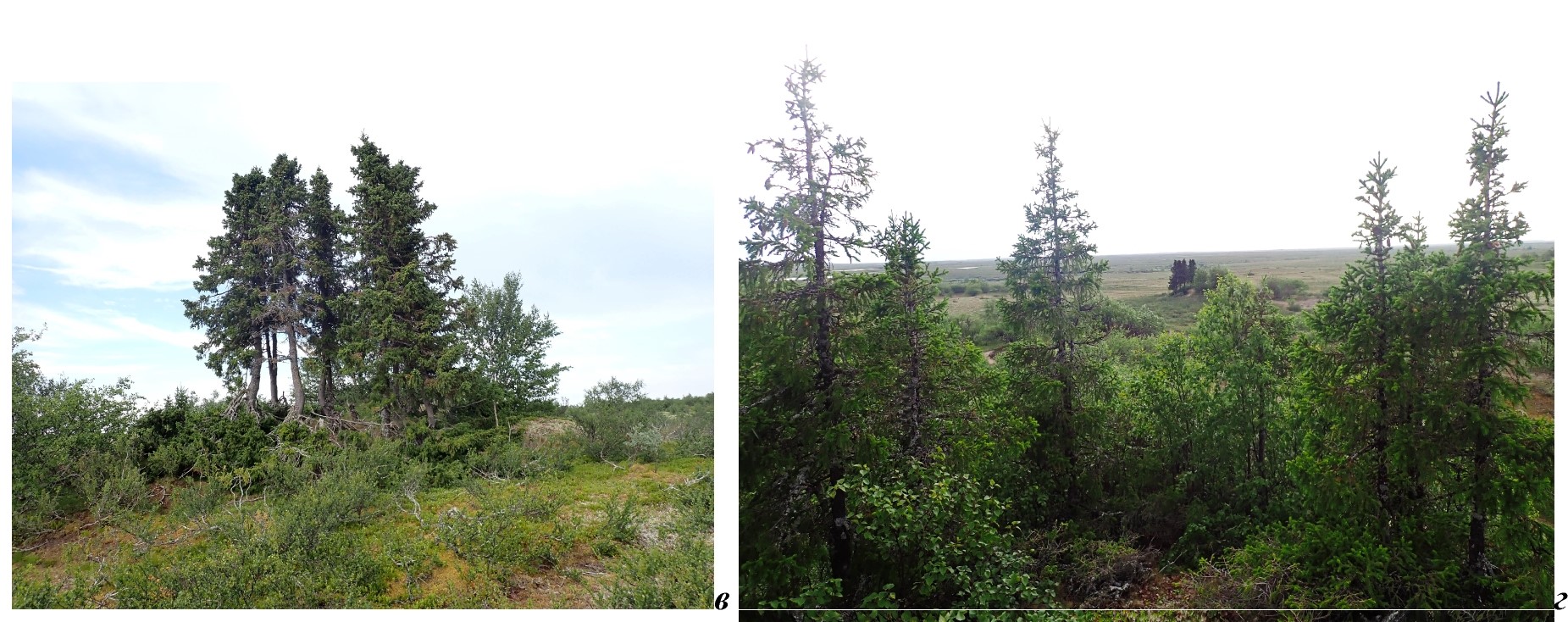 The northern forest boundary (timberline) in East European Russia is formed by Picea obovata and runs at N 67°30ʹ-67°10ʹ. In the Bolshezemelskaya Tundra, spruce is found rather far north of the forest boundary and even north of N 68°. Spruce islands have been preserved here since the Holocene in refugia – sites with favorable microclimatic and soil conditions. Relict spruce islands are groups of closely spaced, thin-stemmed trees occupying upland landform elements on sandy outcrops of watersheds. Skirt-shaped growth trees are united by a common root system and appear to be clones formed by vegetative propagation [Lavrinenko, Lavrinenko, 2004a].