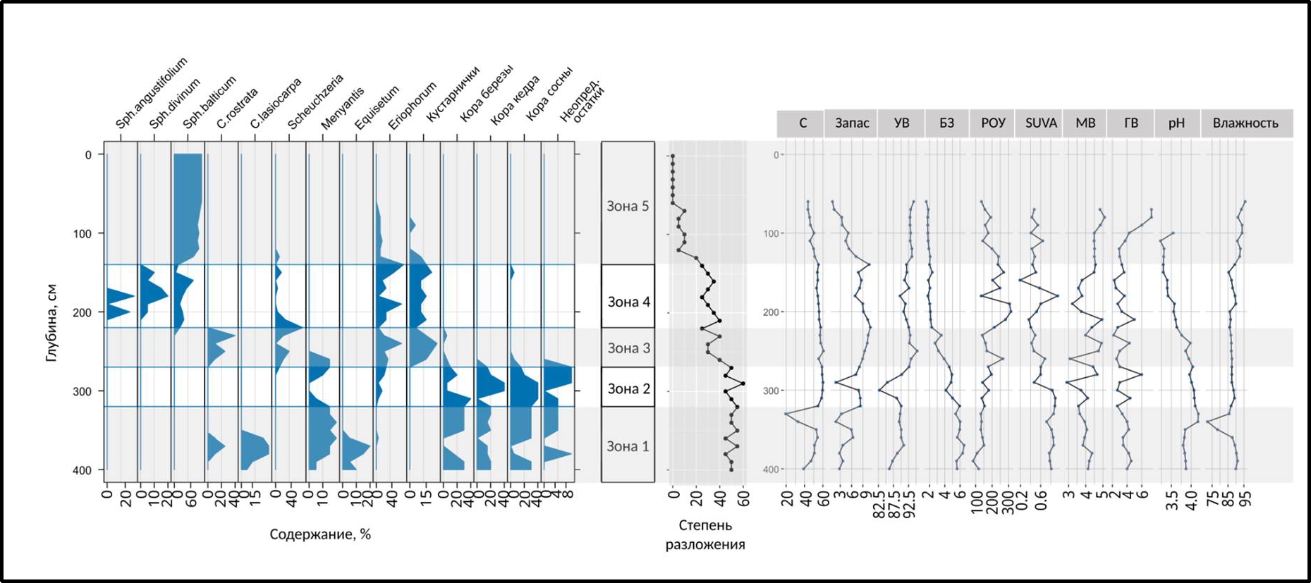 Торфяная залежь имеет глубину 3-4 м с минеральным дном, сложенным супесями, песками и суглинками [Syr'eva, 2017; Lapshina et al., 2020]. Основными растениями-торфообразователями в современном растительном покрове являются Sph. divinum, Sph. balticum, Sph. angustifolium, E. vaginatum, Scheuchzeria palustris, C. limosa, C. rostrata и древесные остатки.