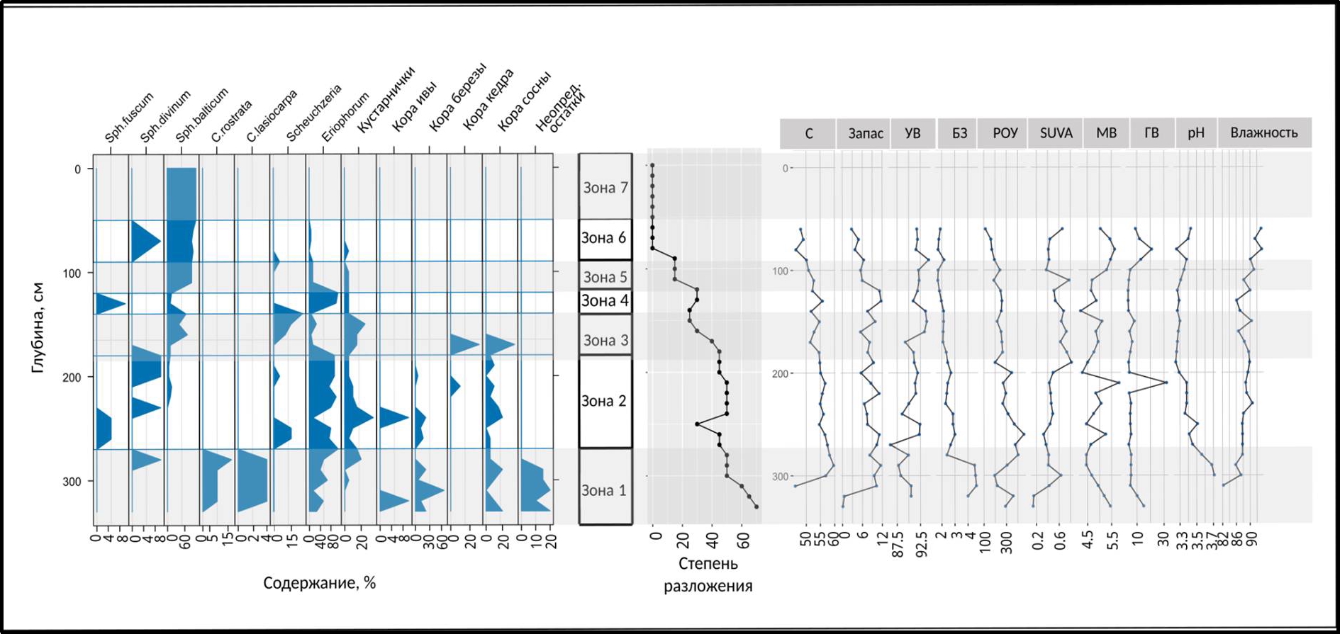 Целью данного исследования была оценка влияния ботанического состава и физико-химических параметров торфяной залежи на количество и состав РОУ.