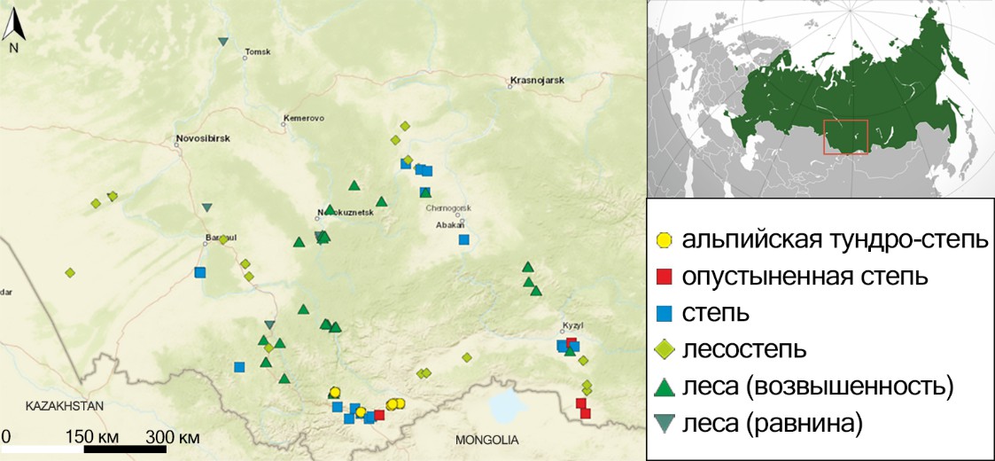 Рисунок 1. Расположение точек отбора современных (субрецентных) спорово-пыльцевых спектров в Алтае-Саянском горном регионе и прилегающих частях равнин (в каждой точке отбиралось от 1 до 6 образцов). Значками обозначены ключевые биотопы.