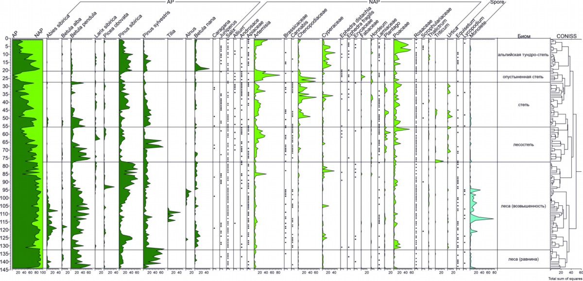 Перед анализом все спектры были ранжированы по градиенту высоты от равнинных лесов (внизу диаграммы до высокогорной тундростепи (в верхней части диаграммы) на основе геоботанических описаний соответствующих биомов (рис. 2). Связанный кластерный анализ всей выборки современных с.п.с. выделил 9 кластеров, которые хорошо отражают естественную широтную и высотную зональность исследуемого региона. Биом равнинных лесов выделяется внизу графика кластером с доминированием пыльцы сосны обыкновенной (Pinus sylvestris) при содоминирующей роли пыльцы березы повислой (Betula pendula). Спектры биома горных лесов оказались представлены 3 кластерами, один из которых связан с равнинными лесами, другой – с лесостепями. Третий (центральный и более независимый) кластер отражает спектры с обилием пыльцы пихты (Abies sibirica) и берёзы при повышенном обилии спор папоротников (Monolete). Этот кластер отражает горные темнохвойные берёзово-пихтовые высокотравно-папоротниковые леса и черневые леса, распространённые на западных склонах Кузнецкого Алатау и на северных склонах Западного Саяна. Горные кедровые леса здесь занимают верхнюю часть лесного пояса, а в Центральном Алтае они совместно с лиственницей формируют лесной пояс. Поскольку в этих лесах исчезает высокотравно-папоротниковый покров, но возрастает участие осок, то в спорово-пыльцевых спектрах этого кластера абсолютно доминирует пыльца кедра сибирского (Pinus sibirica), повышено обилие пыльцы карликовой берёзки (Betula nana) и осоки, но исчезают споры папоротников. Пыльца сосны обыкновенной присутствует в них в фоновом обилии.