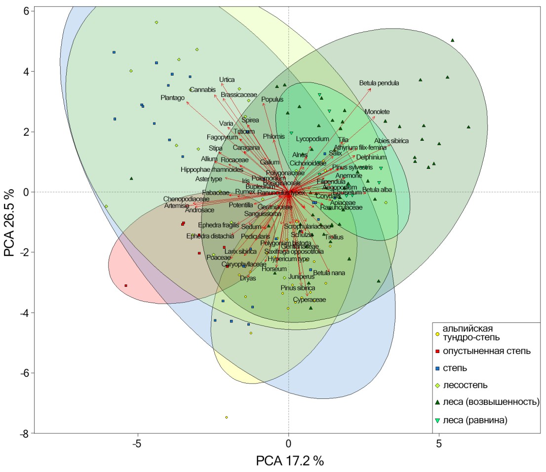 Для PCA были использованы только таксоны, представленные не менее чем в 4 спорово-пыльцевых спектрах. Результаты PCA-анализа четко распределяют пыльцевые типы по биомам: равнинных лесов; горных лесов; лесостепи; степей; опустыненной степи и альпийской тундростепи (рис. 3). Судя по распределению видов и их экологии, ось 1, объясняющая 7,2% вариабельности спектров, отражает градиент влажности, а ось 2, объясняющая 6,2% вариабельности, связана с градиентом температуры. Соответственно этим градиентам распределились типы палиноморф. Выделяются поля соответствующих биомов, которые на рисунке 3 обозначены разными значками и цветом овалов. Так, в наиболее влажных и тёплых условиях в правой верхней четверти графика PCA расположены палиноморфы, характерные для биомов равнинных лесов и горных темнохвойных и черневых лесов с обилием пихты (Abies sibirica), берёзы (Betula pendula) и липы (Tilia) c высокотравно-папоротниковым травяным покровом. В холодных и сухих условиях (левая нижняя четверть графика PCA) расположены палиноморфы биомов альпийской тундростепи (желтый овал) и опустыненной степи (розовый овал). Биомы равнинных лесов, горных темнохвойных и черневых лесов практически не пересекаются с биомами альпийской тундростепи и опустыненной степи на графике PCA.