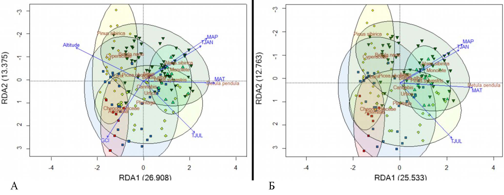 Рисунок 4. Биплоты RDA-анализа выборки из 145 современных спорово-пыльцевых спектров Алтае-Саянского региона и прилегающих частей равнин. А – до теста VIF, Б – после теста VIF (условные обозначения см. на рис. 3).