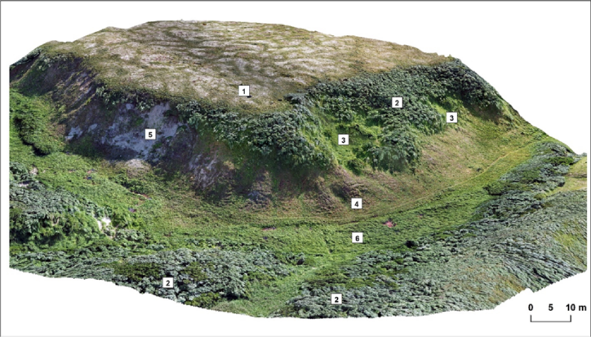 Fig. 2. Panoramic image of a ravine and adjacent terrace on Cape Bolvanskiy Nos (northwest of Bolshezemelskaya tundra), prepared based on the results of processing Mavic Pro UAV images; diagnostic syntaxa: 1 – Dryado octopetalae–Hylocomietum splendentis subass. caricetosum capillaris; 2 – Hylocomio splendentis–Salicetum glaucae; 3 – Vicio sepium–Salicetum lanatae; 4 – Salici polaris–Sibbaldietum procumbentis; 5 – rose slopes; 6 – Caricetum aquatilis [by Lavrinenko, 2023].