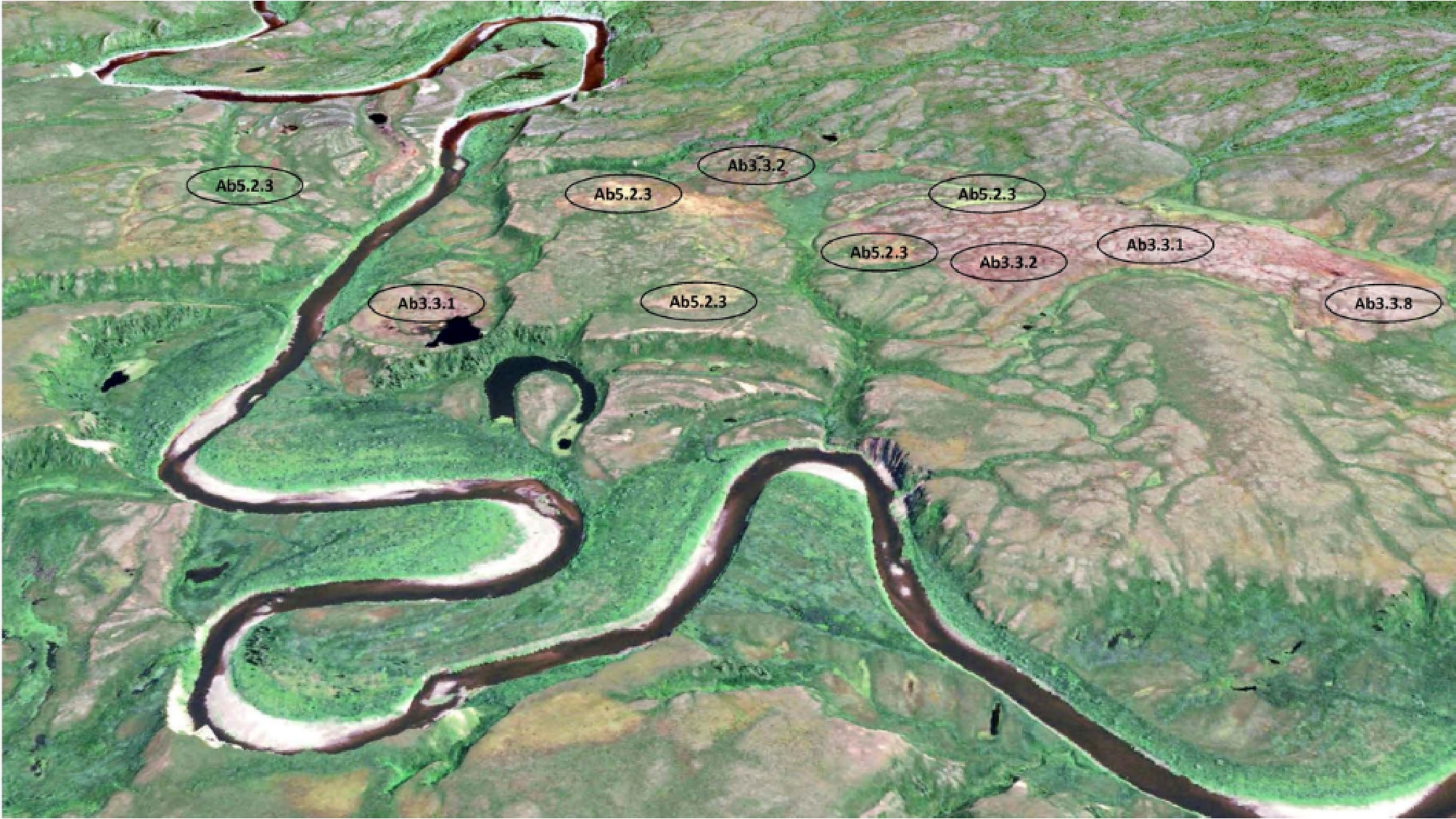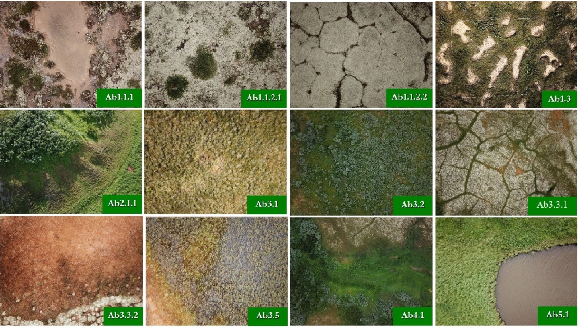 Fig. 3. UAV images of different habitat categories in the East European tundra (Ab1.1.1 – psammophytic biotopes of the most elevated areas of watersheds; Ab1.1.2.1 – drained biotopes of flat terraces covered with lichen and dwarf-shrub-lichen tundra; Ab1.1.2.2 – the same, with distinct polygonization of the nanorelief; Ab1.3 – biotopes of eluvial landscapes with loamy (neutral) substrates; Ab2.1.1 – snowbed biotopes on slopes of depressions, hills, ridges; Ab3.1-Ab3.5 – mire biotopes (see text); Ab4.1 – biotopes of shallow runoff gully; Ab5.1 – lakeside depression biotopes.