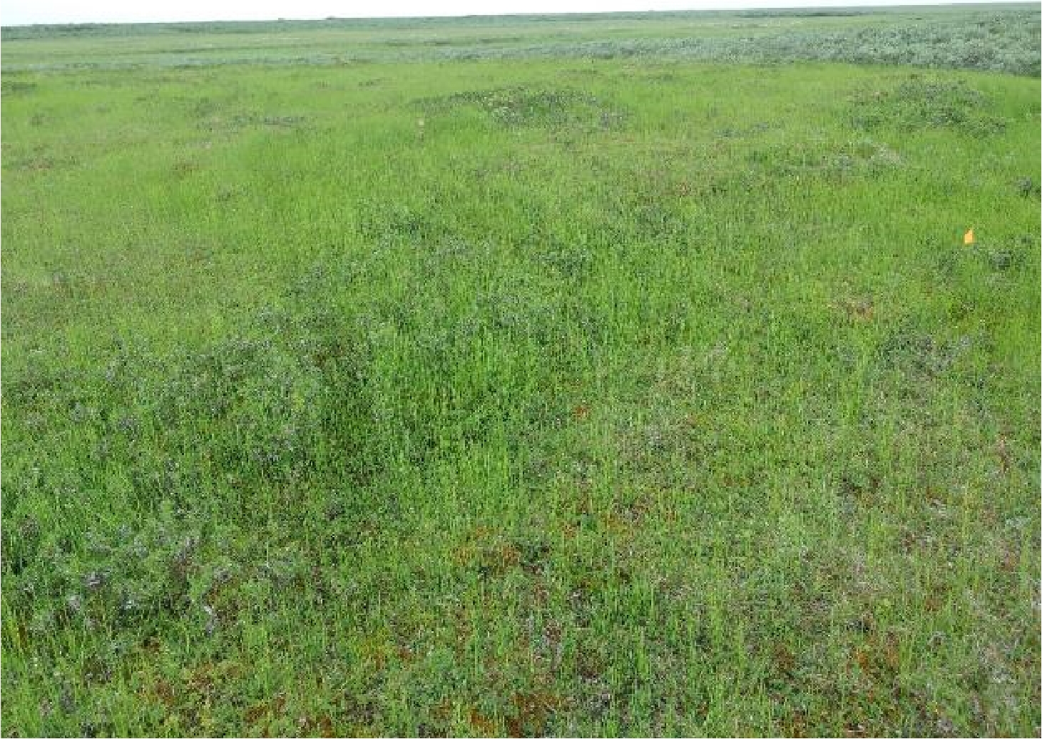 Рис. П15. Местообитание с редкоивовым (Salix reptans) осоково-гипновым сообществом с присутствием арктического разнотравья на обширной заболоченной морской террасе (арктические минеральные болота) (ТЕР Carici stantis–Salicichorietea reptantis salicetosum myrsinitae).