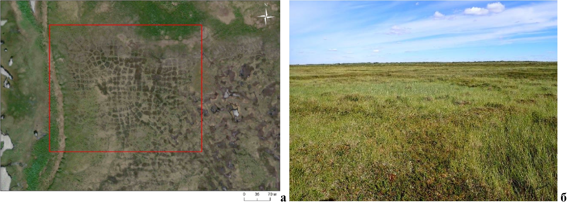 Рис. П13а и б. Местообитание валиково-полигональновогнутого болота (ТЕР Pleurozio schreberi–Eriophoretum vaginati—Carici rotundatae–Sphagnochorietum lindbergii) на спутниковом снимке (а) и на местности (б).