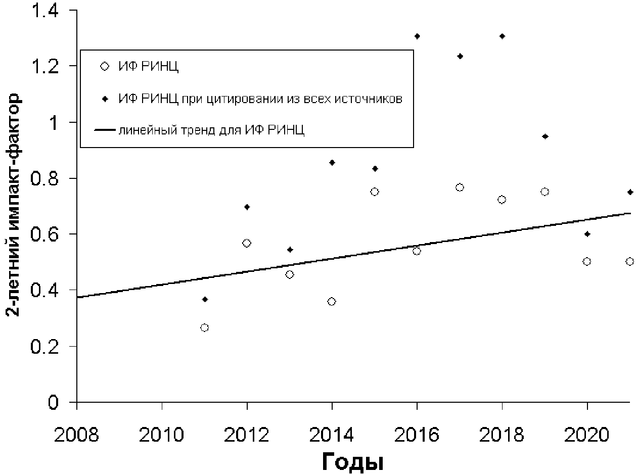 Краеугольный камень онтологии и репрезентации науки – цитирование. Согласно И.В. Маршаковой-Шайкевич, «цитирование… – факт бытия науки и объект науковедческого исследования, надежность которого определяется самой традицией науки как социального института. Феномен цитирования является неоспоримо важной этической нормой в науке, общенаучным регулятором… и, безусловно, одним из важных средств научной коммуникации» [Ponkin, Red’kina, 2019, p. 13]. В свете этого, анализируя состояние дел в ДОСиГИК, естественно будет начать с анализа показателей, связанных с цитированием статей этого журнала. На Рис. 1 приведена динамика 2-летних ИФ (РИНЦ) – обычного8 и учитывающего цитирования из всех источников. К сожалению, за прошедший относительно короткий срок трудно сделать статистически значимые выводы. С формальной точки зрения есть некоторый положительный тренд: за 15 лет ИФ журнала вырос примерно в два раза. Однако при внимательном рассмотрении становится очевидным, что этот (и даже более высокий) рост произошел в первые годы существования ДОСиГИК, после чего наблюдались некоторые колебания импакт-фактора, но говорить об устойчивом тренде, к сожалению, пока не приходится.