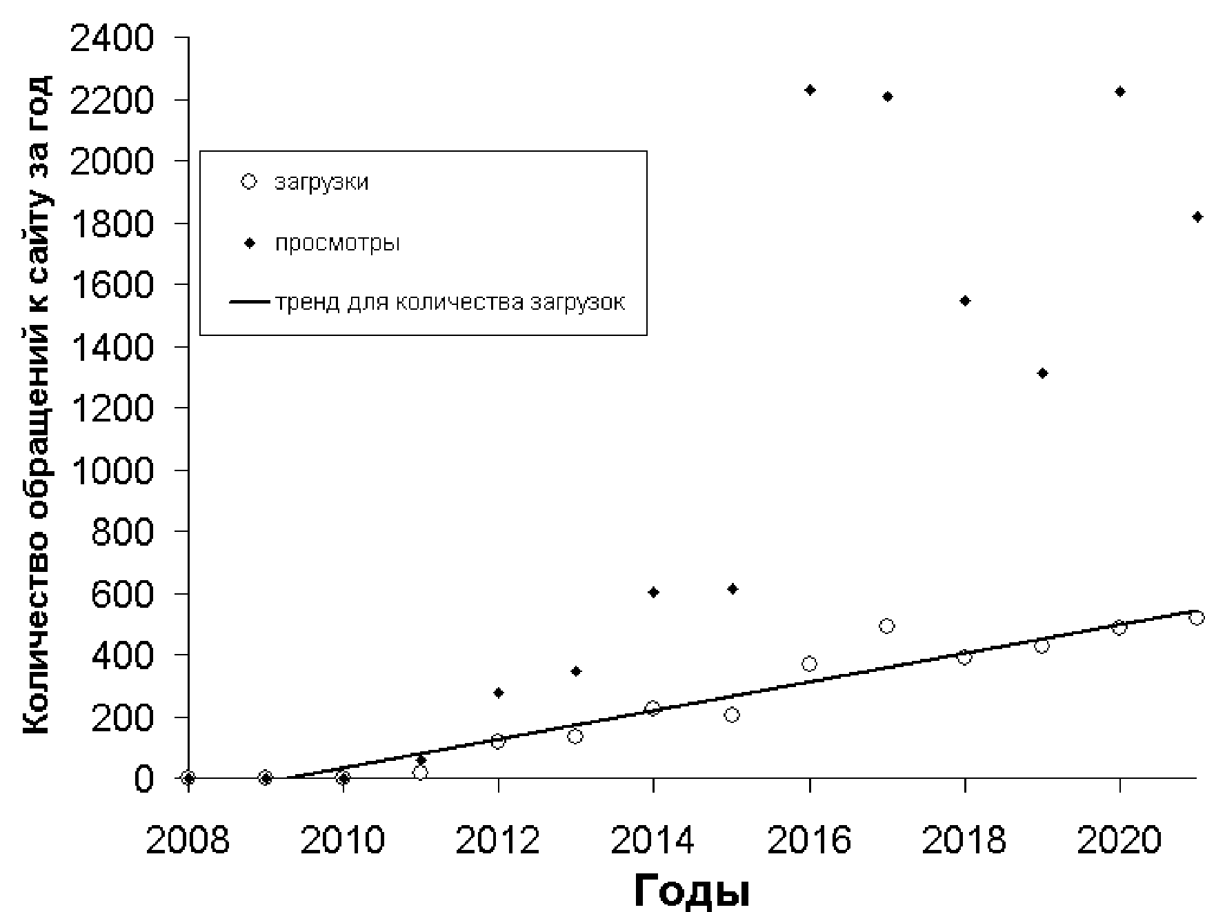 Ниже будет представлена динамика ряда наукометрических показателей, но прежде считаем нужным сделать одно замечание. В [Glagolev et al., 2018] была опубликована динамика этих показателей до 2016 г. включительно. Поскольку eLibrary приводит информацию за 10 лет, то сейчас5 мы можем видеть на ОСНЭБ данные для 2012-2021 гг. Таким образом, некоторые из этих данных (за 2012-2016 гг.) пересекаются с представленными в [Glagolev et al., 2018] и, казалось бы, должны совпадать с ними. Однако совпадения почти никогда нет. Этому может быть как минимум две причины: