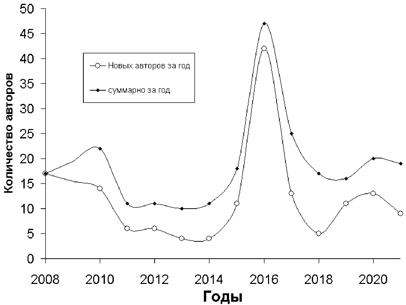 Количество авторов, публикующихся в течение года в «Динамике окружающей среды…» (Рис. 4), все время остается примерно на одном и том же уровне – около 16 чел., причем ежегодная доля новых авторов также примерно постоянна – около 50%. Исключением, чрезвычайно «урожайным» на авторов (и особенно на новых авторов), явился 2016 г., но это было обусловлено выходом в свет специального выпуска ДОСиГИК, посвященного докладам и материалам школы-конференции «Биогенные архивы ландшафтных изменений прошлого»).